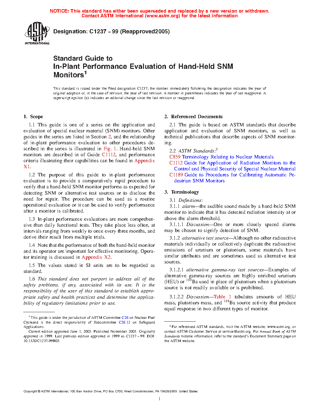1.1 This guide is one of a series on the application and evaluation of special nuclear material (SNM) monitors. Other guides in the series are listed in Section 2, and the relationship of in-plant performance evaluation to other procedures described in the series is illustrated in Fig. 1. Hand-held SNM monitors are described in of Guide C1112, and performance criteria illustrating their capabilities can be found in Appendix X1.