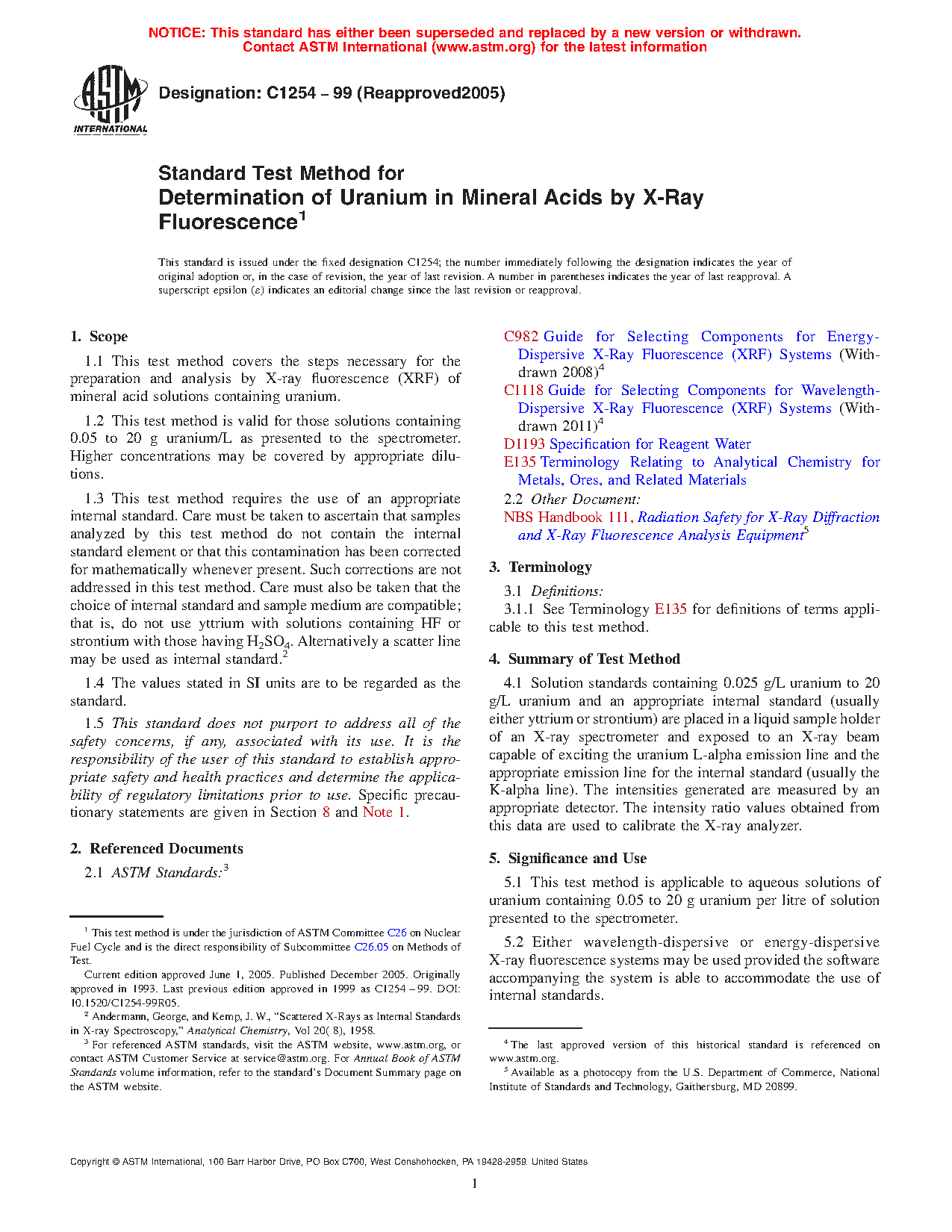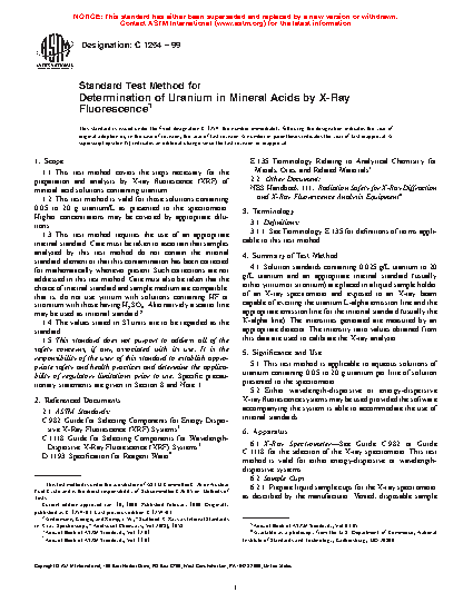 1.1 This test method covers the steps necessary for the preparation and analysis by X-ray fluorescence (XRF) of mineral acid solutions containing uranium.