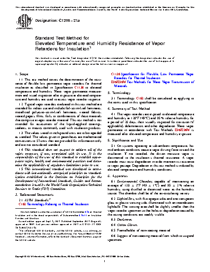 1.1 This test method covers the determination of the resistance of flexible low permeance vapor retarders for thermal insulation as classified in Specification C1136 to elevated temperature and humidity. Water vapor permeance measurement and visual inspection after exposure at elevated temperature and humidity are used to assess vapor retarder response.