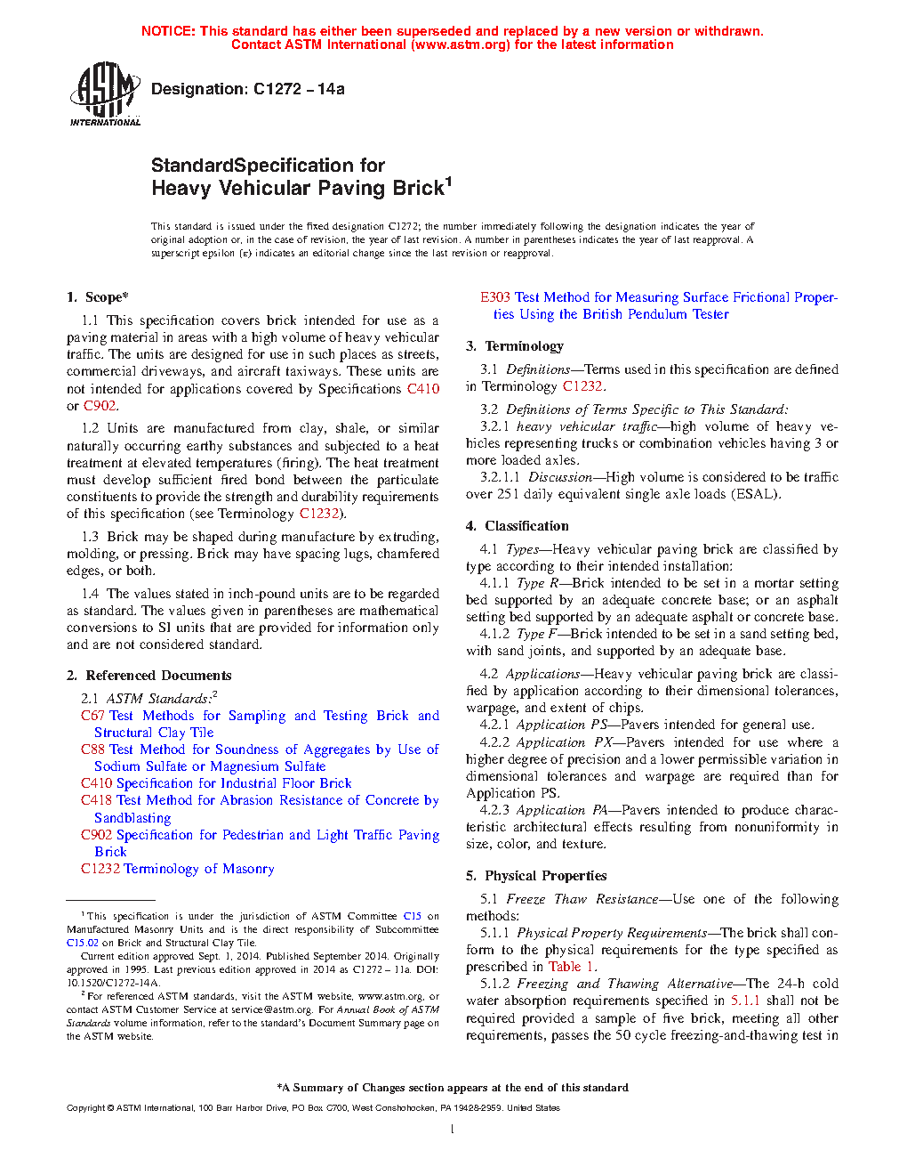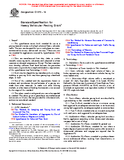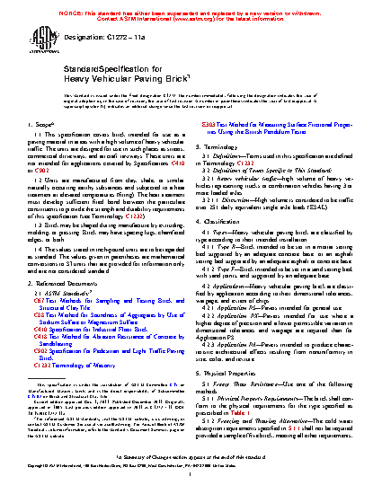 1.1 This specification covers brick intended for use as a paving material in areas with a high volume of heavy vehicular traffic. The units are designed for use in such places as streets, commercial driveways, and aircraft taxiways. These units are not intended for applications covered by Specifications C410 or C902.