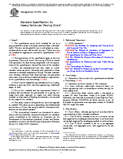 This specification covers heavy vehicular paving bricks designed for use in streets, commercial driveways, aircraft taxiways, and other places where there is a high volume of heavy vehicular traffic. The bricks should be manufactured from clay, shale, or similar naturally occurring earthy substances and subjected to firing. The high temperature heat treatment should develop sufficient fired bonds between the material particles to produce the required strength and durability. The bricks may also be shaped by extruding, molding, or pressing during manufacture and may have spacing lugs, chamfered edges, or both. The materials are classified into two types according to the intended installation and should all conform to the required values of freeze thaw resistance, abrasion resistance, skid resistance, coring, chips or cracks, and efflorescence.