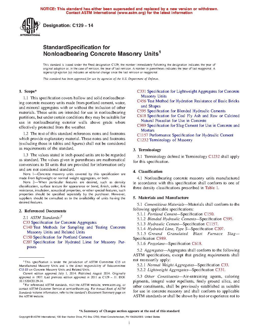 This specification covers hollow and solid nonloadbearing concrete masonry units made from Portland cement, water, and mineral aggregates with or without the inclusion of other materials. These units are intended for use in nonloadbearing partitions, but under certain conditions they may be suitable for use in nonloadbearing exterior walls above grade where effectively protected from the weather. Concrete masonry units manufactured under this specification shall conform to the specified density classifications and compressive strength requirements.
