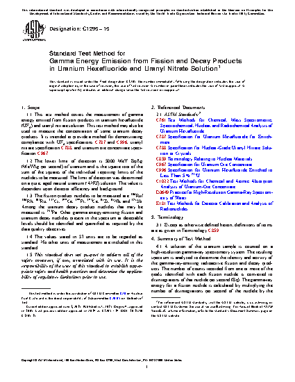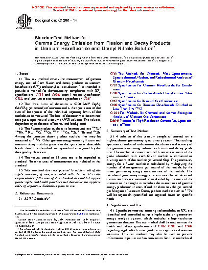 1.1 This test method covers the measurement of gamma energy emitted from fission products in uranium hexafluoride (UF6) and uranyl nitrate solution. This test method may also be used to measure the concentration of some uranium decay products. It is intended to provide a method for demonstrating compliance with UF6 specifications C787 and C996, uranyl nitrate specification C788, and uranium ore concentrate specification C967.
