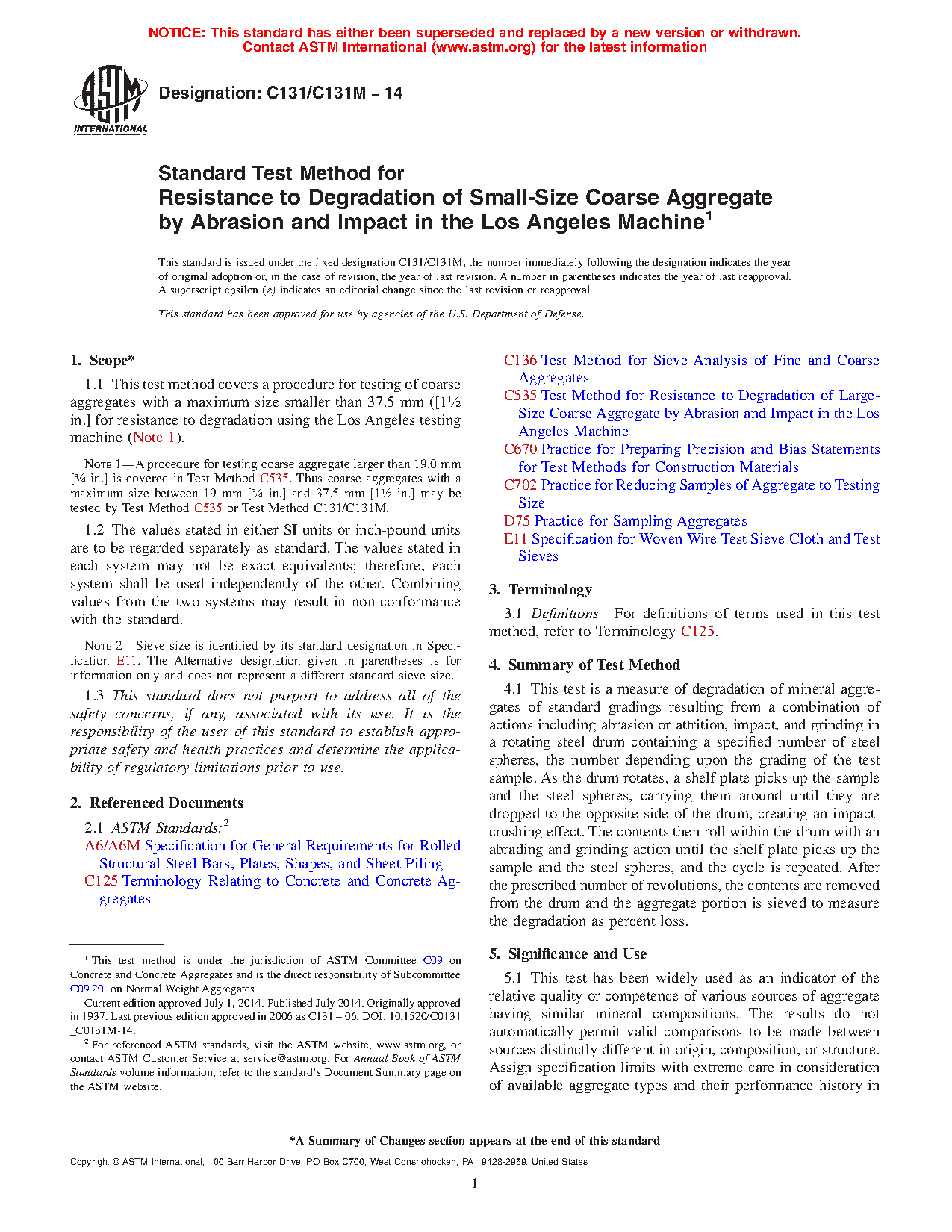 Note 1: A procedure for testing coarse aggregate larger than 19.0 mm [3/4 in.] is covered in Test Method C535. Thus coarse aggregates with a maximum size between 19 mm [3/4 in.] and 37.5 mm [11/2 in.] may be tested by Test Method C535 or Test Method C131/C131M.