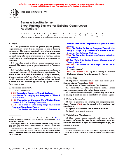This specification identifies the material properties that are important for sheet radiant barrier products. When appropriate, values for the properties have been stated.