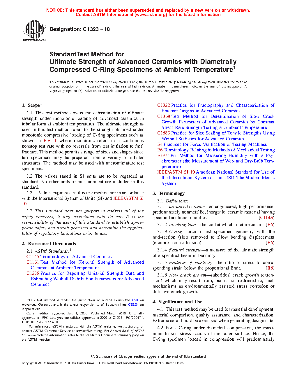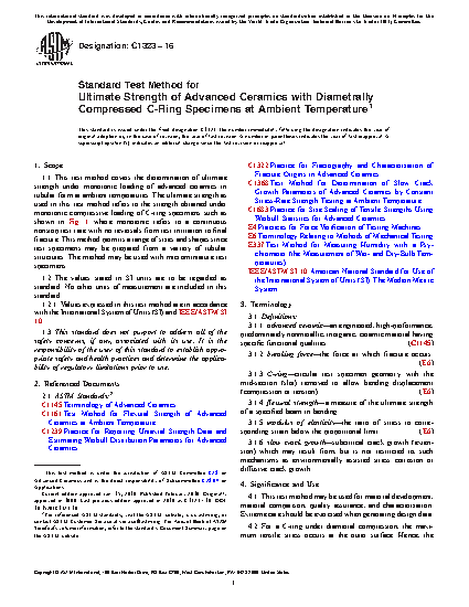 1.1 This test method covers the determination of ultimate strength under monotonic loading of advanced ceramics in tubular form at ambient temperatures. Note that ultimate strength as used in this test method refers to the strength obtained under monotonic compressive loading of C-ring specimens where monotonic refers to a continuous nonstop test rate with no reversals from test initiation to final fracture.