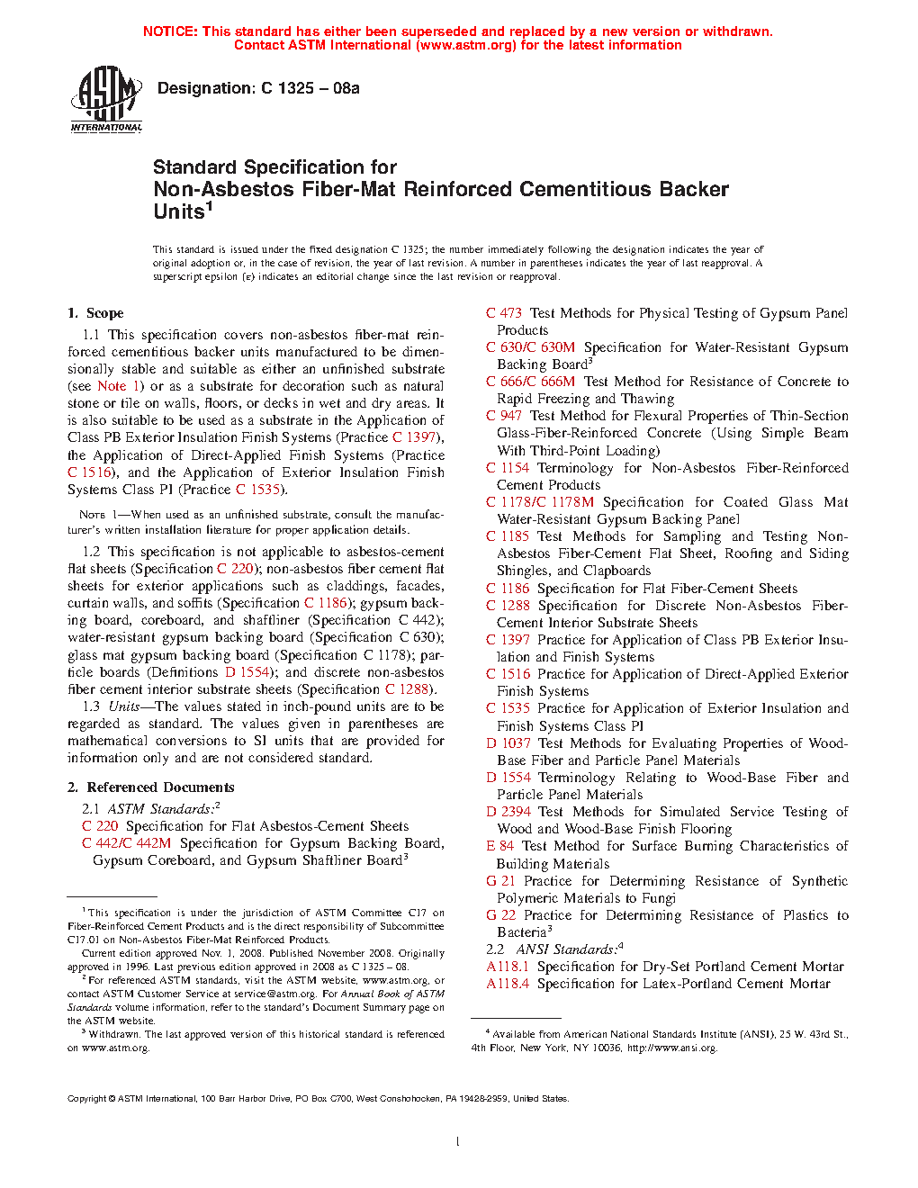 1.1 This specification covers non-asbestos fiber-mat reinforced cementitious backer units manufactured to be dimensionally stable and suitable as either an unfinished substrate (see Note 1) or as a substrate for decoration such as natural stone or tile on walls, floors, or decks in wet and dry areas. It is also suitable to be used as a substrate in the Application of Class PB Exterior Insulation Finish Systems (Practice C1397), the Application of Direct-Applied Finish Systems (Practice C1516), and the Application of Exterior Insulation Finish Systems Class PI (Practice C1535).