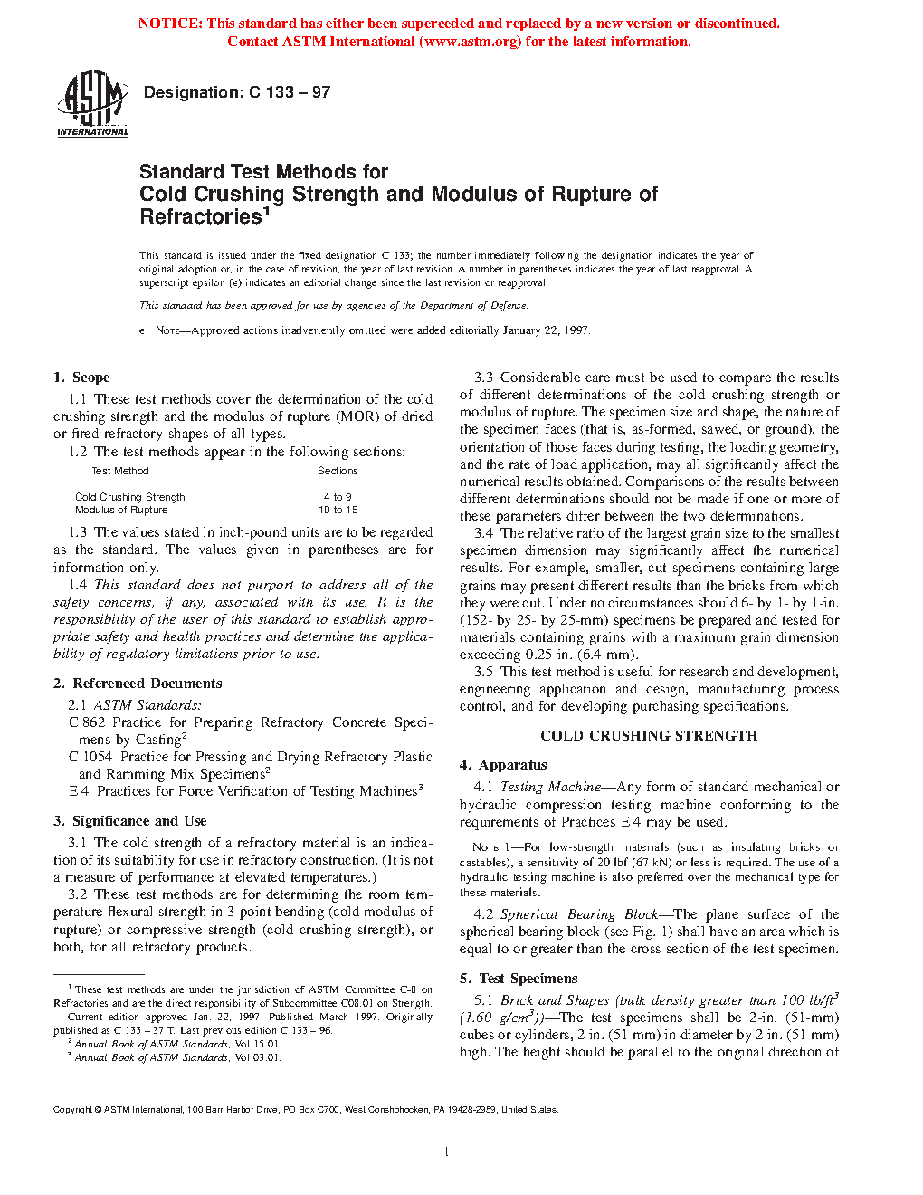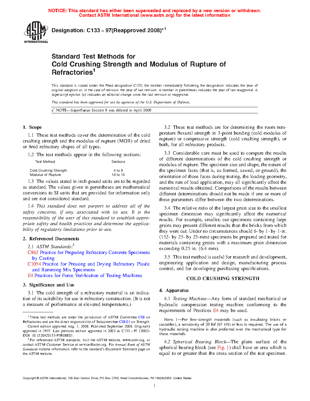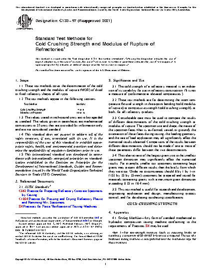 Test Method Sections Cold Crushing Strength 4 to 9 Modulus of Rupture 10 to 151.3 The values stated in inch-pound units are to be regarded as the standard. The values given in parentheses are for information only.