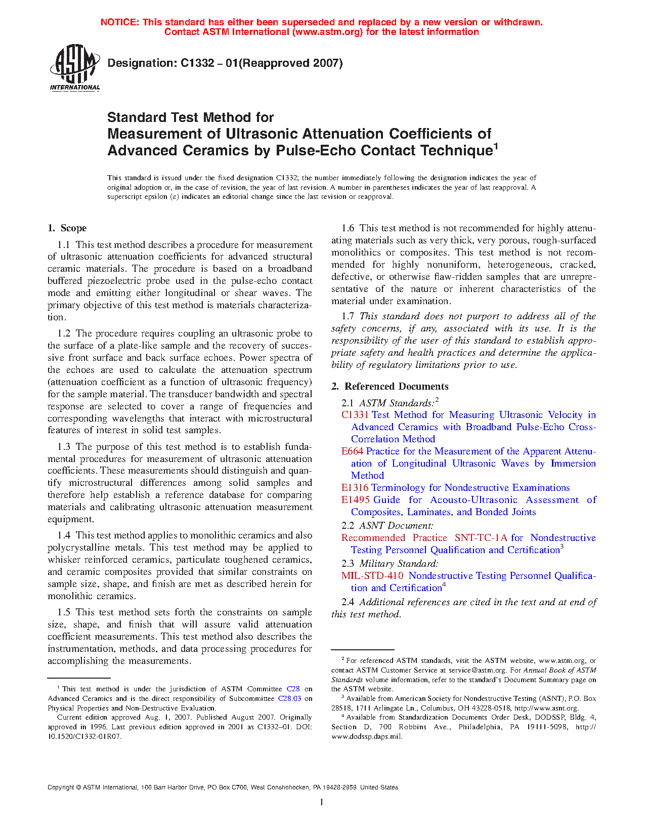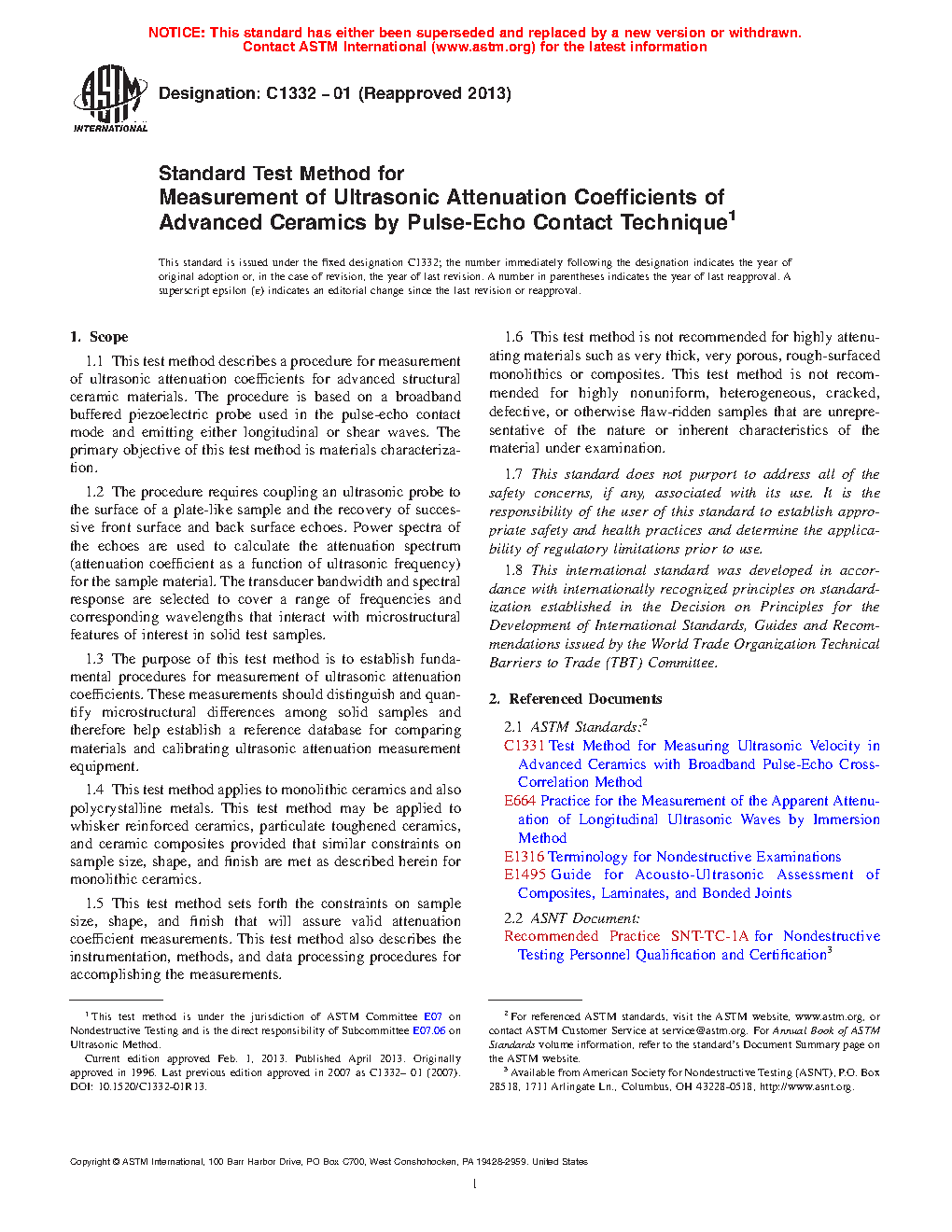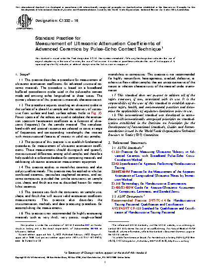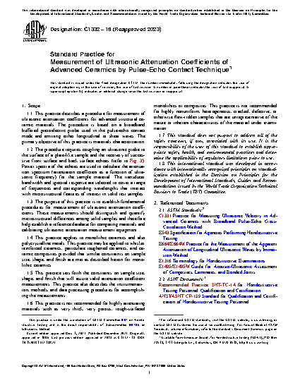 1.1 This test method describes a procedure for measurement of ultrasonic attenuation coefficients for advanced structural ceramic materials. The procedure is based on a broadband buffered piezoelectric probe used in the pulse-echo contact mode and emitting either longitudinal or shear waves. The primary objective of this test method is materials characterization.