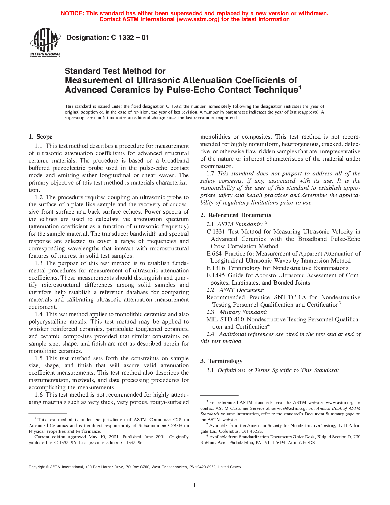 1.6 This test method is not recommended for highly attenuating materials such as very thick, very porous, rough-surfaced monolithics or composites. This test method is not recommended for highly nonuniform, heterogeneous, cracked, defective, or otherwise flaw-ridden samples that are unrepresentative of the nature or inherent characteristics of the material under examination.