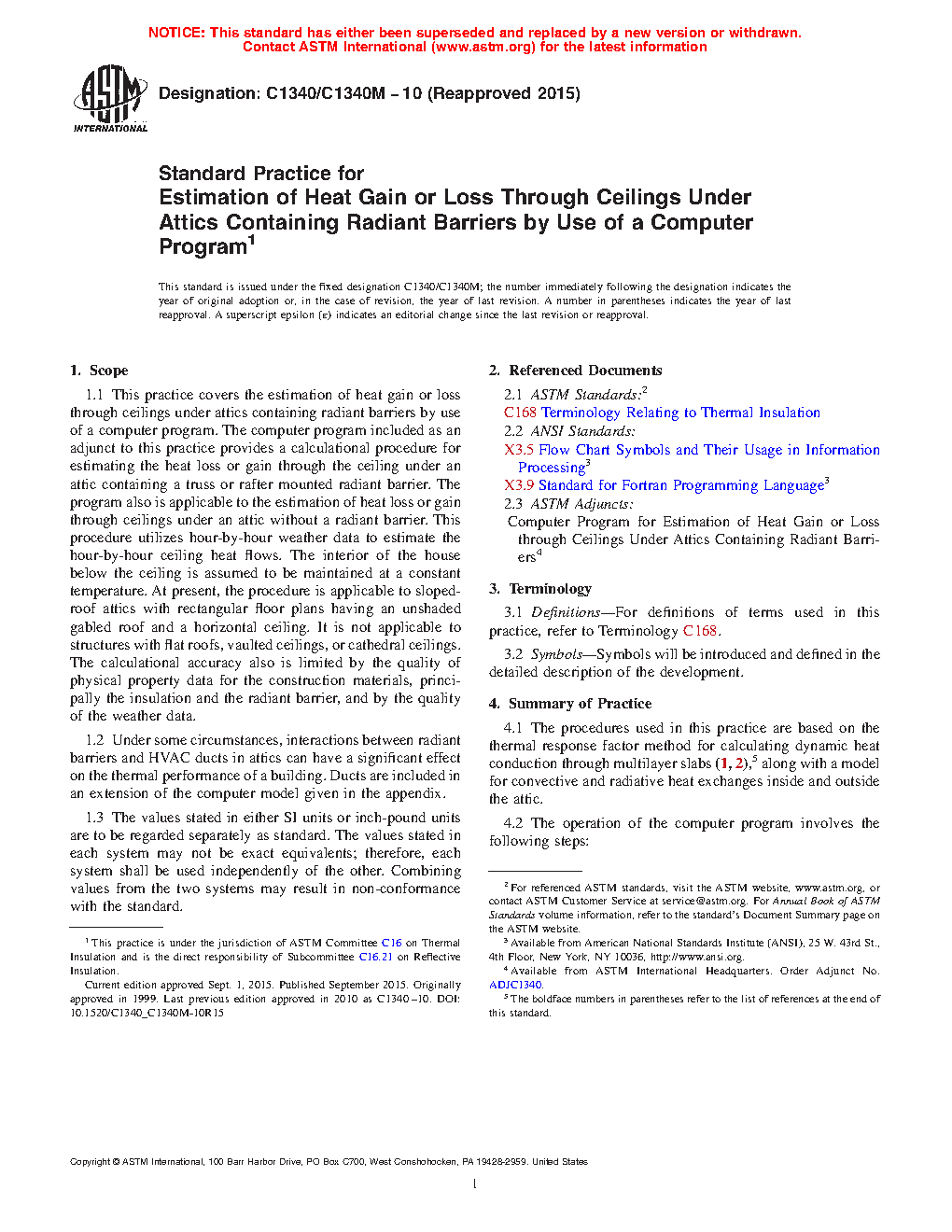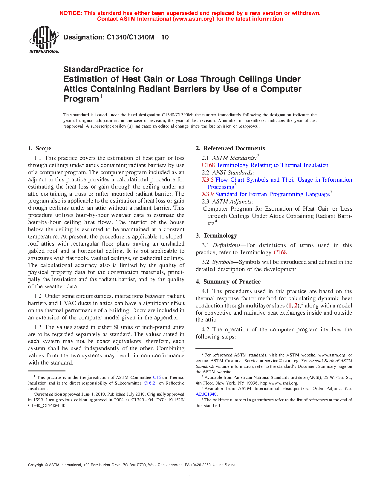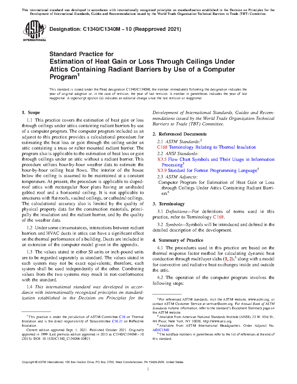 1.1 This practice covers the estimation of heat gain or loss through ceilings under attics containing radiant barriers by use of a computer program. The computer program included as an adjunct to this practice provides a calculational procedure for estimating the heat loss or gain through the ceiling under an attic containing a truss or rafter mounted radiant barrier. The program also is applicable to the estimation of heat loss or gain through ceilings under an attic without a radiant barrier. This procedure utilizes hour-by-hour weather data to estimate the hour-by-hour ceiling heat flows. The interior of the house below the ceiling is assumed to be maintained at a constant temperature. At present, the procedure is applicable to sloped-roof attics with rectangular floor plans having an unshaded gabled roof and a horizontal ceiling. It is not applicable to structures with flat roofs, vaulted ceilings, or cathedral ceilings. The calculational accuracy also is limited by the quality of physical property data for the construction materials, principally the insulation and the radiant barrier, and by the quality of the weather data.