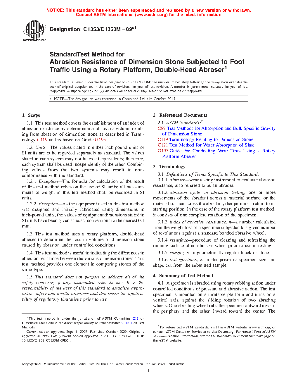 1.3 This test method uses a rotary platform abraser to determine the loss in volume of dimension stone caused by abrasion under controlled conditions.