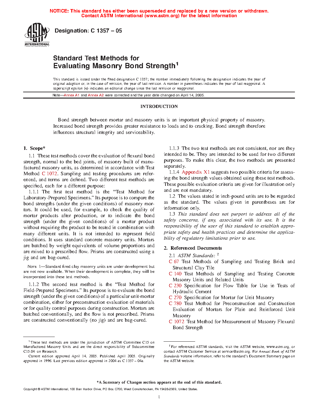 1.1 These test methods cover the evaluation of flexural bond strength, normal to the bed joints, of masonry built of manufactured masonry units, as determined in accordance with Test Method C 1072. Sampling and testing procedures are referenced, and terms are defined. Two different test methods are specified, each for a different purpose: