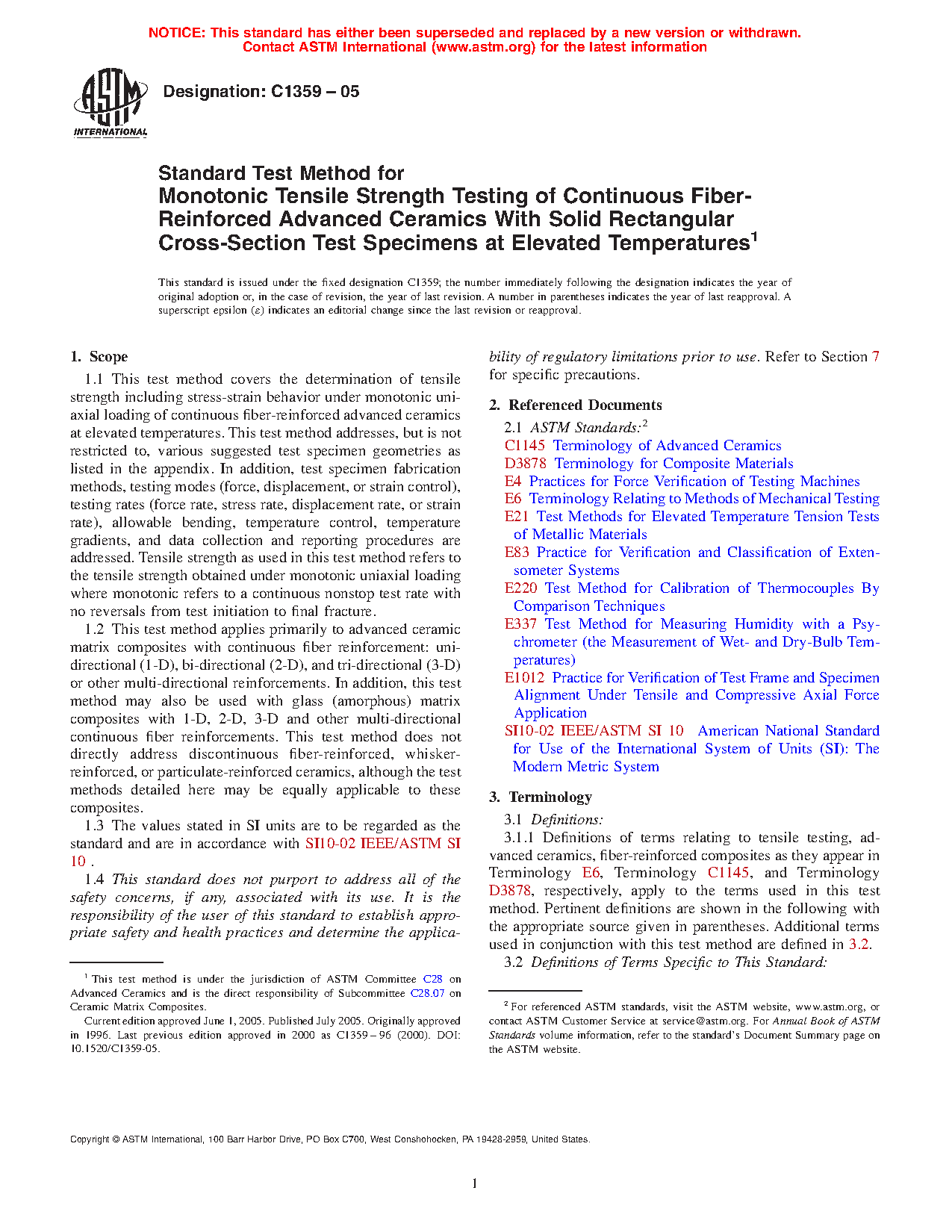 1.1 This test method covers the determination of tensile strength including stress-strain behavior under monotonic uniaxial loading of continuous fiber-reinforced advanced ceramics at elevated temperatures. This test method addresses, but is not restricted to, various suggested test specimen geometries as listed in the appendix. In addition, test specimen fabrication methods, testing modes (force, displacement, or strain control), testing rates (force rate, stress rate, displacement rate, or strain rate), allowable bending, temperature control, temperature gradients, and data collection and reporting procedures are addressed. Tensile strength as used in this test method refers to the tensile strength obtained under monotonic uniaxial loading where monotonic refers to a continuous nonstop test rate with no reversals from test initiation to final fracture.