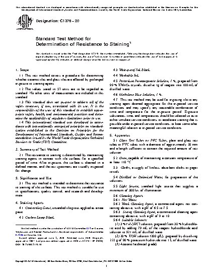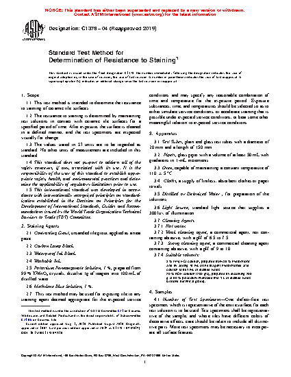 1.2 The resistance to staining is determined by maintaining test solutions in contact with ceramic tile surfaces for a specified period of time. After exposure, the surface is cleaned in a defined manner, and the test specimens are inspected visually for change.
