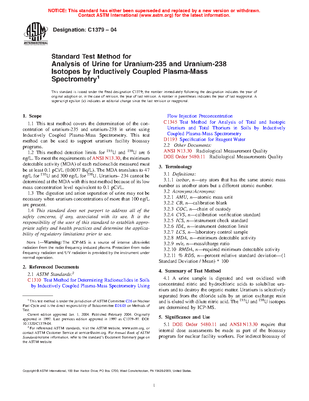 Note 2—Column chromatography separations and concentration of 234U using manual or flow-injection preconcentration followed by ICP-MS isotopic determination are described in Test Methods C 1310 and C 1345