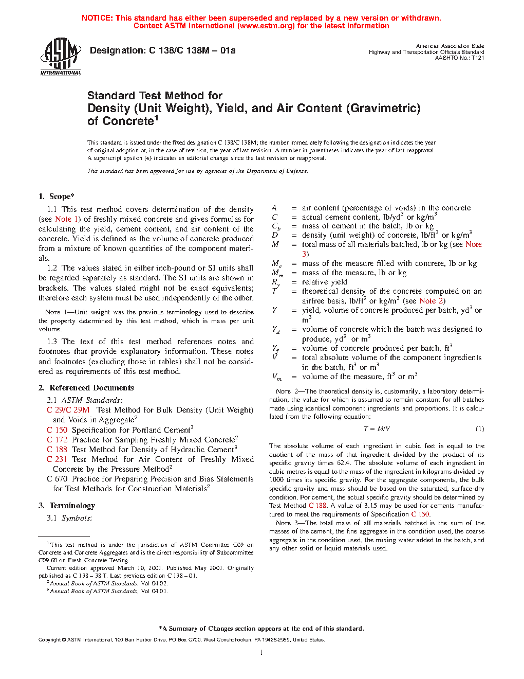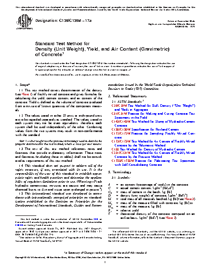 1.1 This test method covers determination of the density (see Note 1) of freshly mixed concrete and gives formulas for calculating the yield, cement content, and air content of the concrete. Yield is defined as the volume of concrete produced from a mixture of known quantities of the component materials.