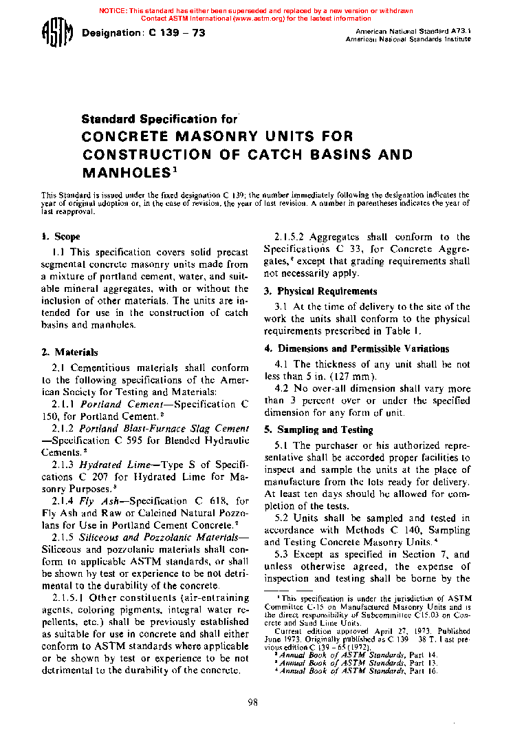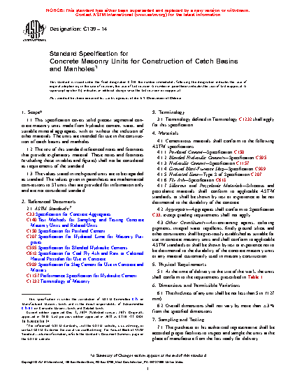 1.1 This specification covers solid precast segmental concrete masonry units made from a mixture of portland cement, water, and suitable mineral aggregates, with or without the inclusion of other materials. The units are intended for use in the construction of catch basins and manholes.