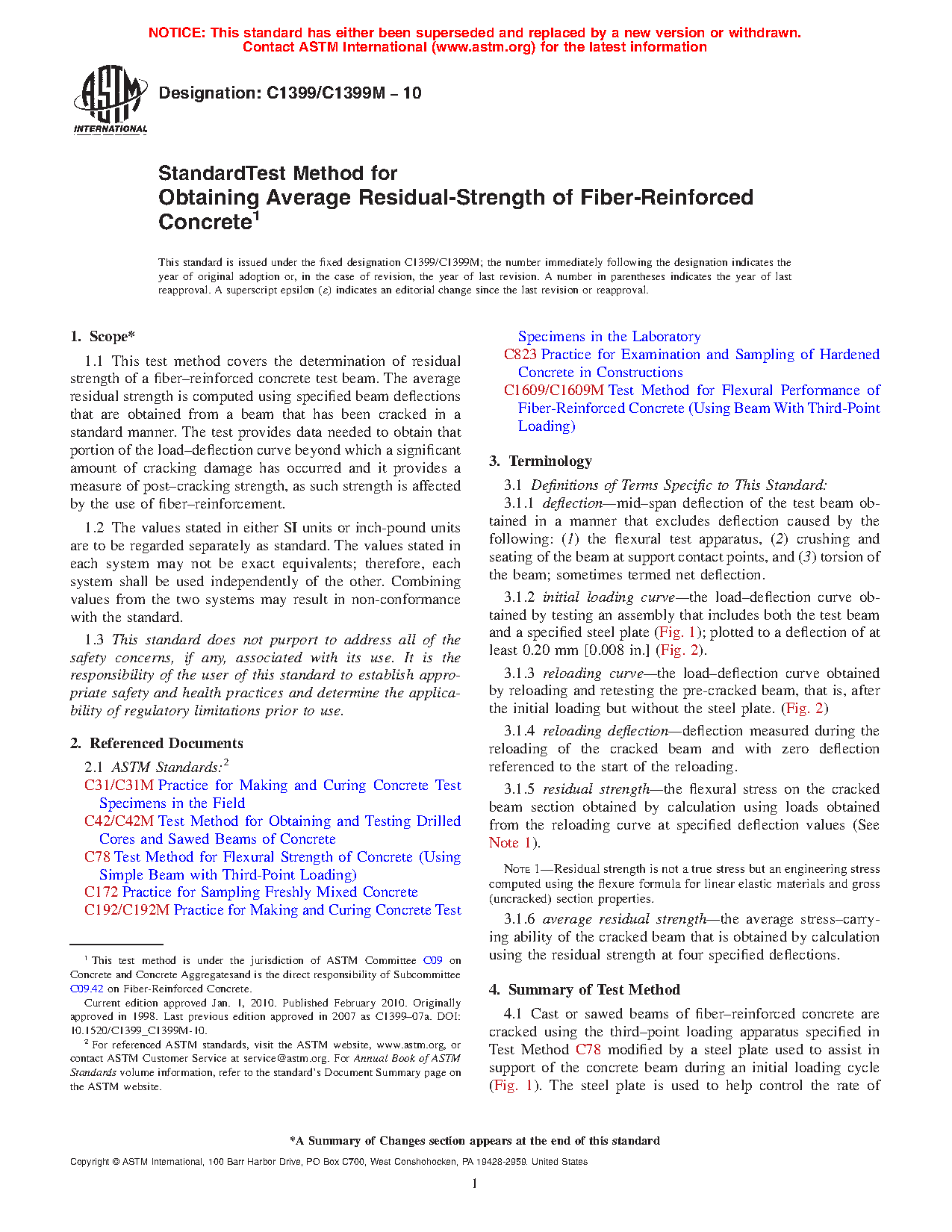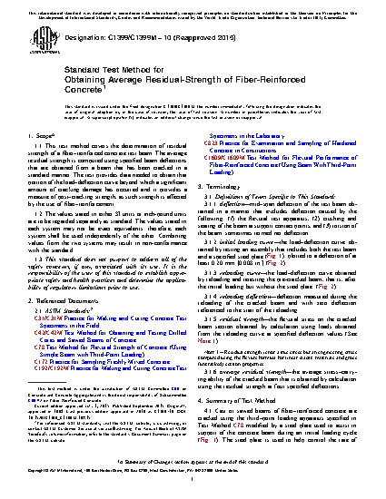 1.1 This test method covers the determination of residual strength of a fiber–reinforced concrete test beam. The average residual strength is computed using specified beam deflections that are obtained from a beam that has been cracked in a standard manner. The test provides data needed to obtain that portion of the load–deflection curve beyond which a significant amount of cracking damage has occurred and it provides a measure of post–cracking strength, as such strength is affected by the use of fiber–reinforcement.