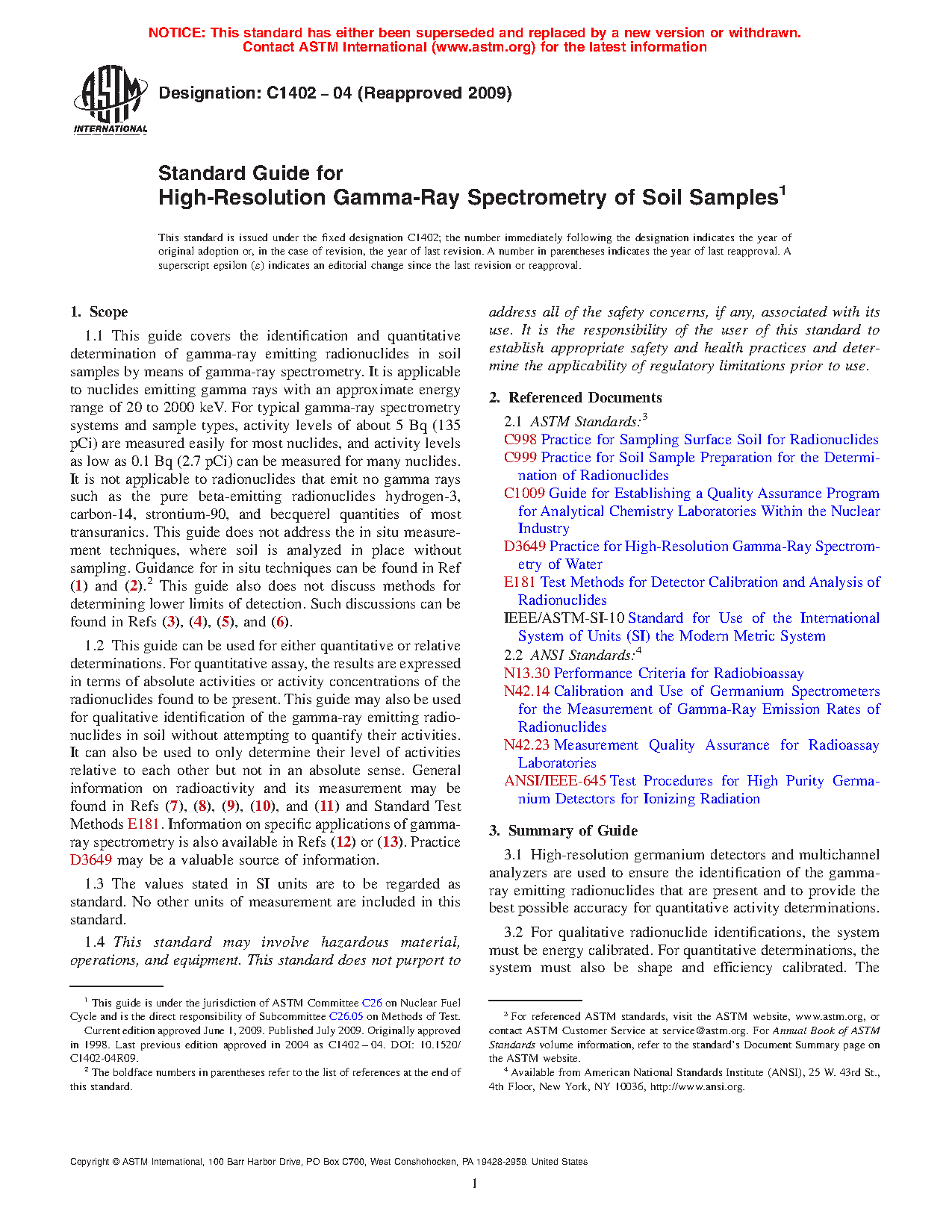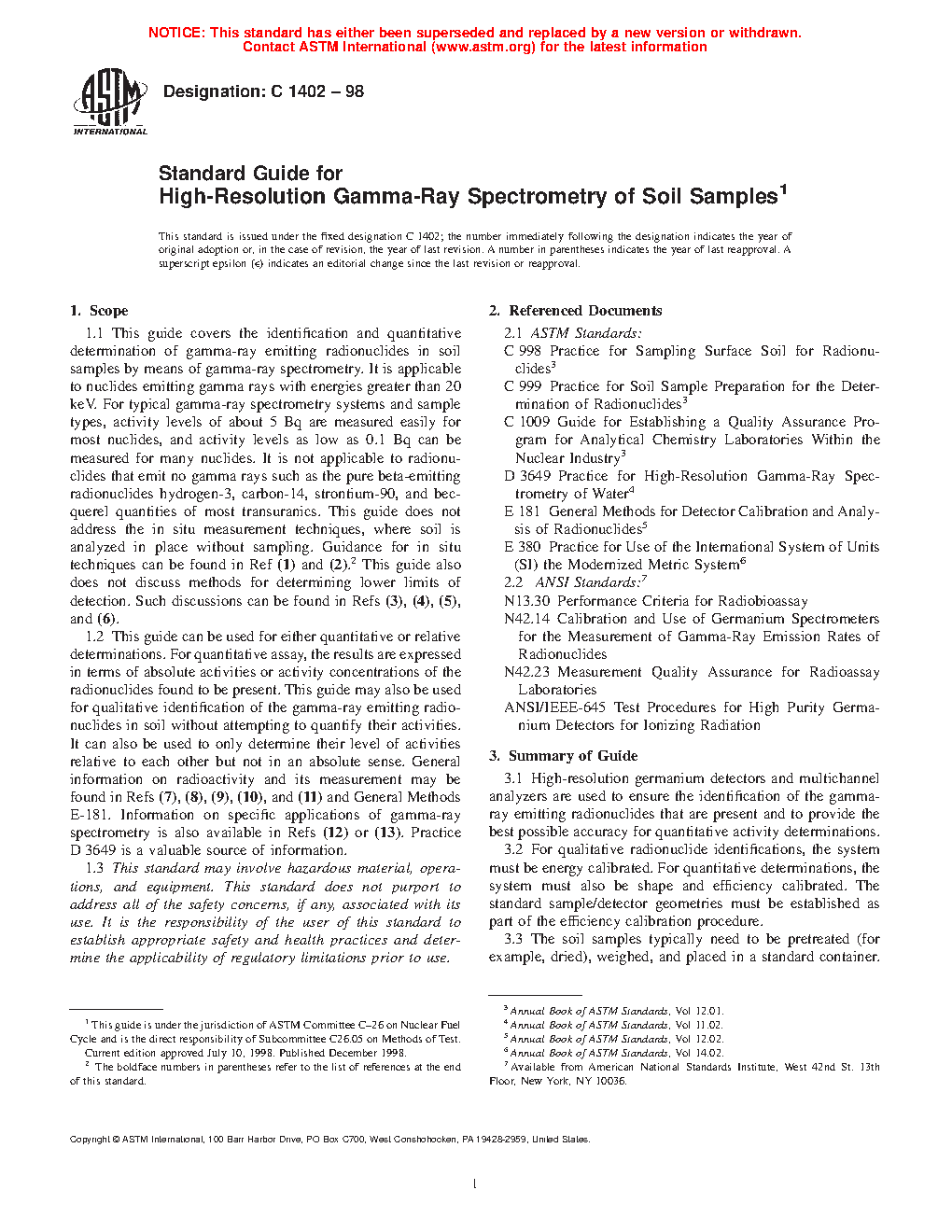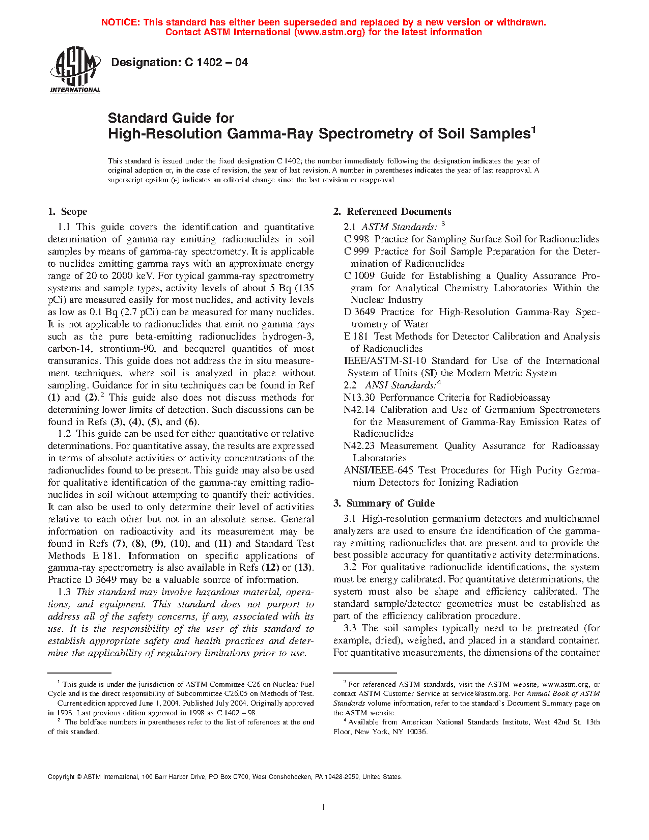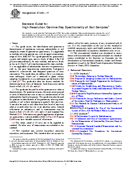 1.1 This guide covers the identification and quantitative determination of gamma-ray emitting radionuclides in soil samples by means of gamma-ray spectrometry. It is applicable to nuclides emitting gamma rays with energies greater than 20 keV. For typical gamma-ray spectrometry systems and sample types, activity levels of about 5 Bq are measured easily for most nuclides, and activity levels as low as 0.1 Bq can be measured for many nuclides. It is not applicable to radionuclides that emit no gamma rays such as the pure beta-emitting radionuclides hydrogen-3, carbon-14, strontium-90, and becquerel quantities of most transuranics. This guide does not address the in situ measurement techniques, where soil is analyzed in place without sampling. Guidance for in situ techniques can be found in Ref (1) and (2). This guide also does not discuss methods for determining lower limits of detection. Such discussions can be found in Refs (3), (4), (5), and (6).
