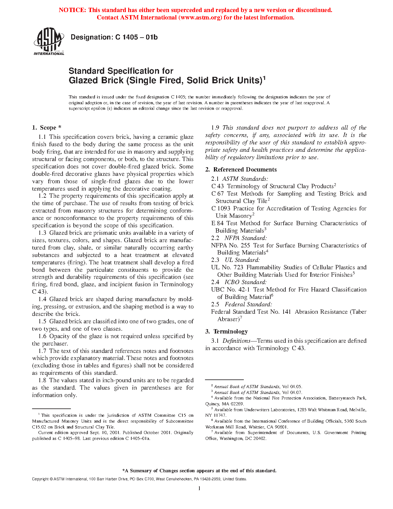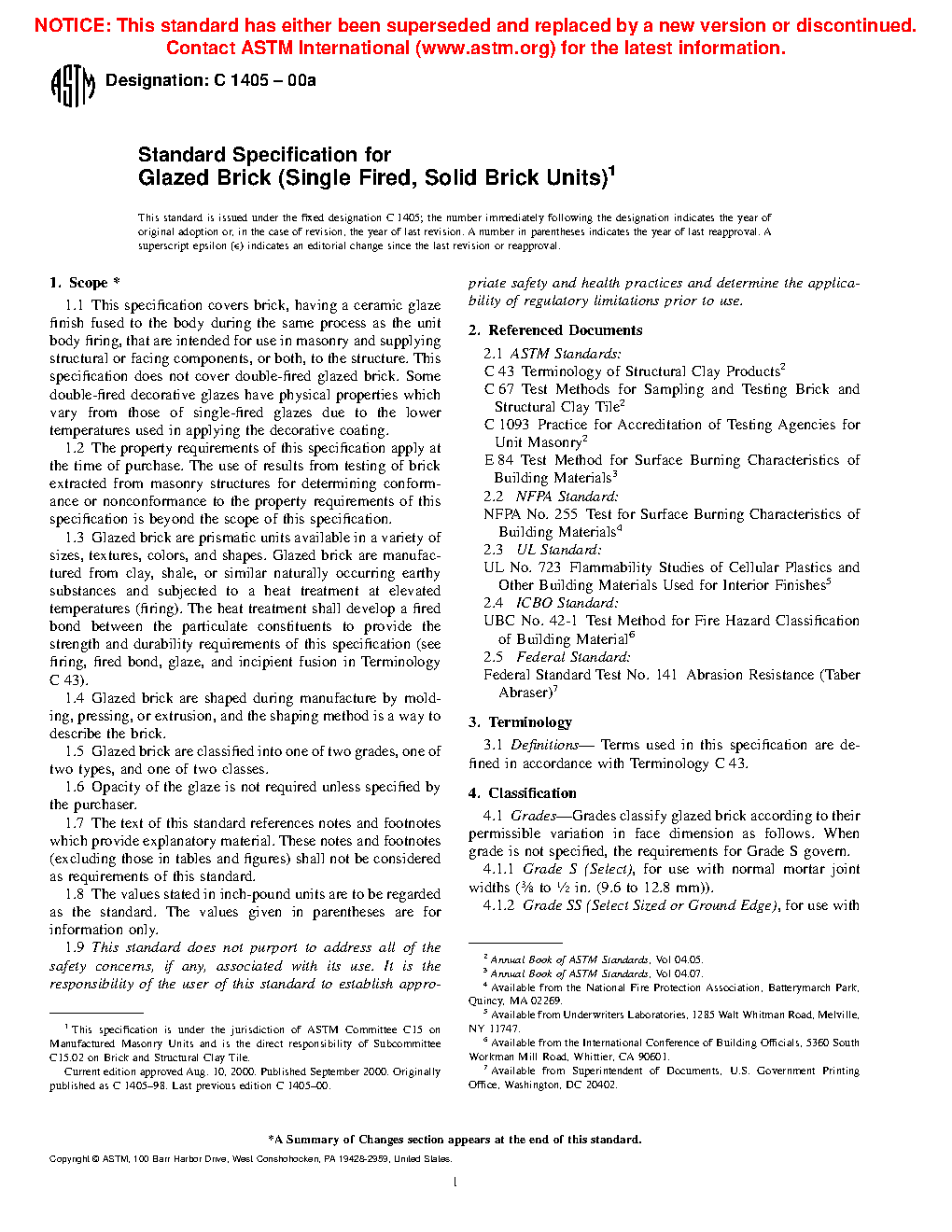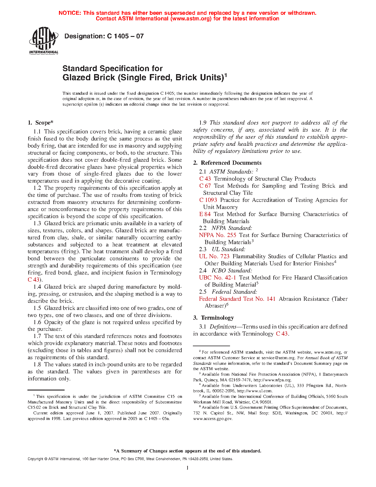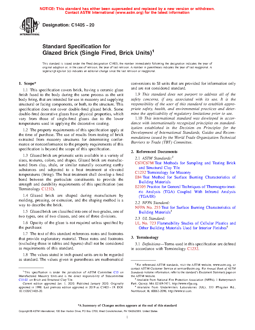 1.1 This specification covers brick, having a ceramic glaze finish fused to the body during the same process as the unit body firing, that are intended for use in masonry and supplying structural or facing components, or both, to the structure. This specification does not cover double-fired glazed brick. Some double-fired decorative glazes have physical properties, which vary from those of single-fired glazes due to the lower temperatures used in applying the decorative coating.