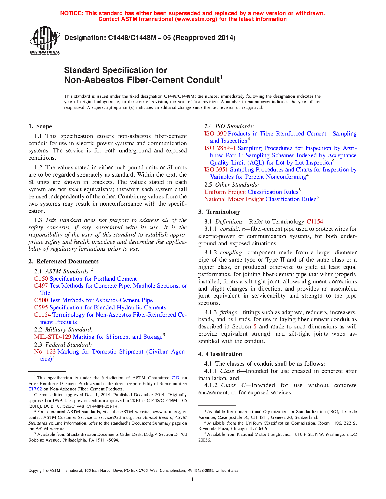 1.1 This specification covers non-asbestos fiber-cement conduit for use in electric-power systems and communication systems. The service is for both underground and exposed conditions.