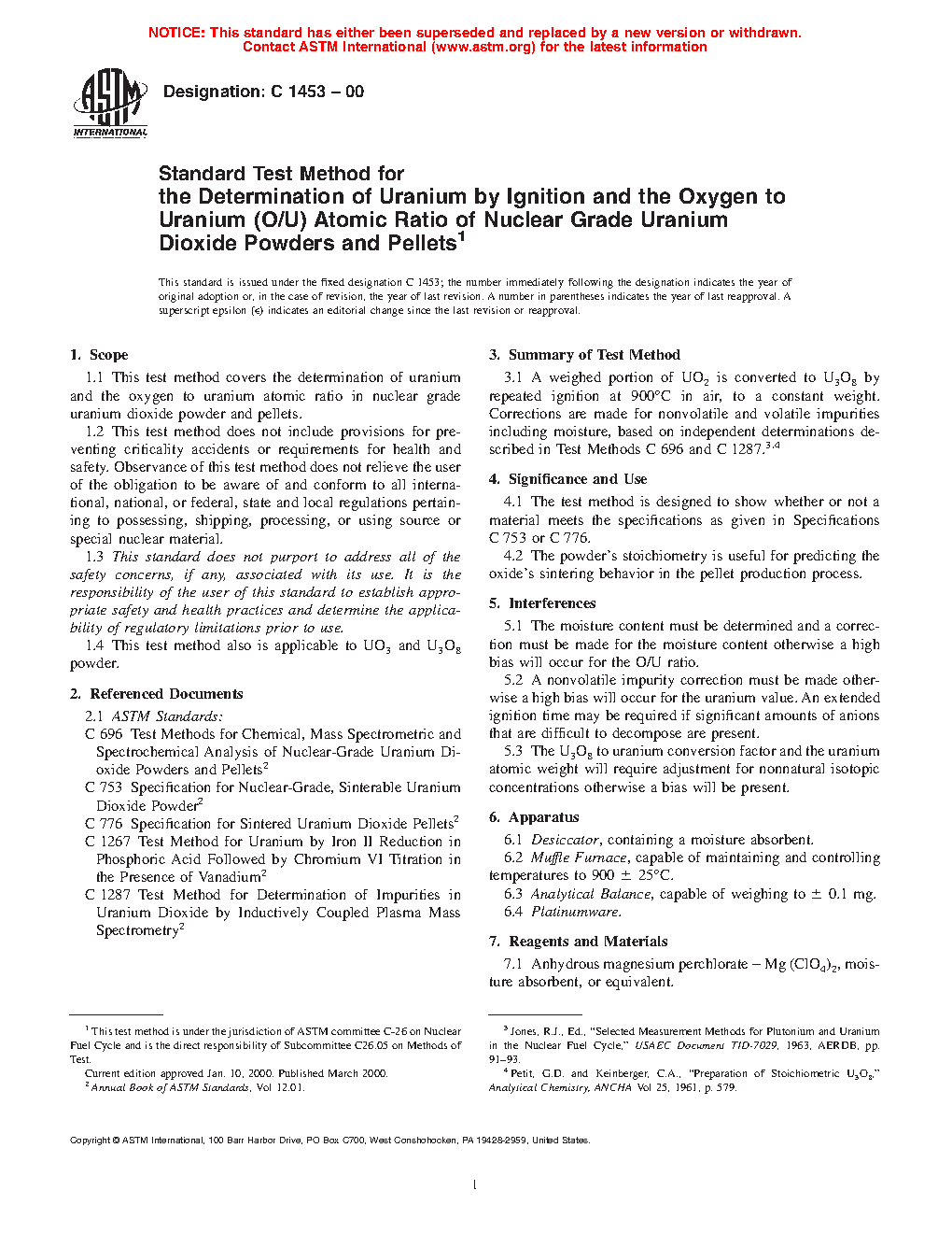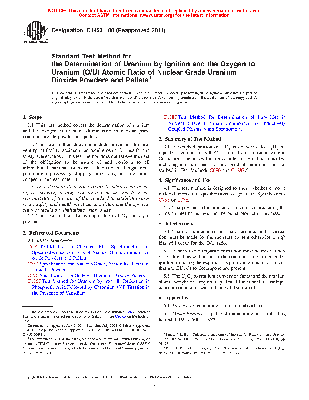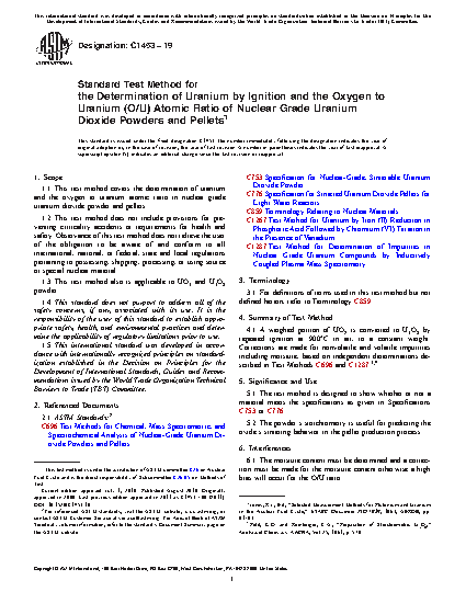 Standard Test Method for the Determination of Uranium by Ignition and the Oxygen to Uranium (O/U) Atomic Ratio of Nuclear Grade Uranium Dioxide Powders and Pellets