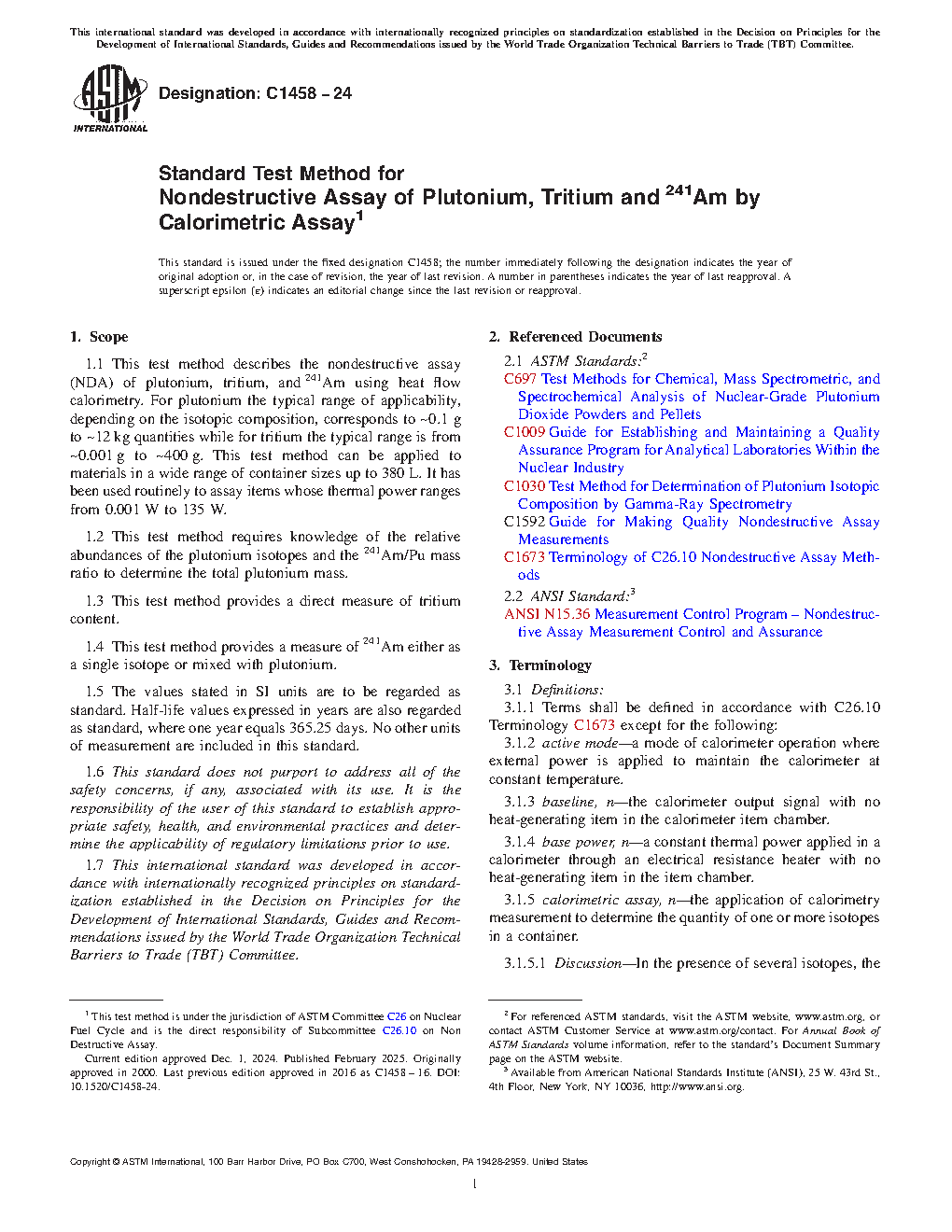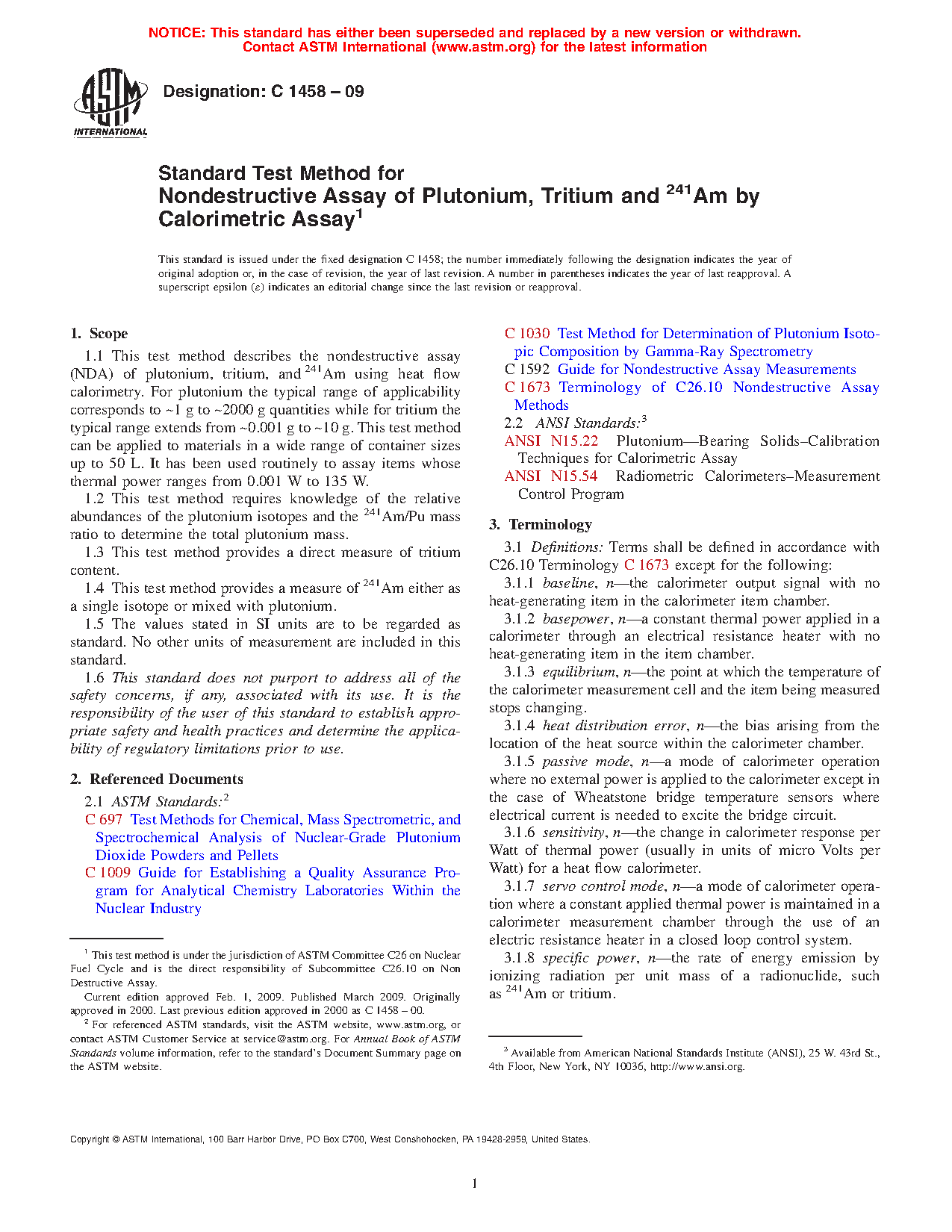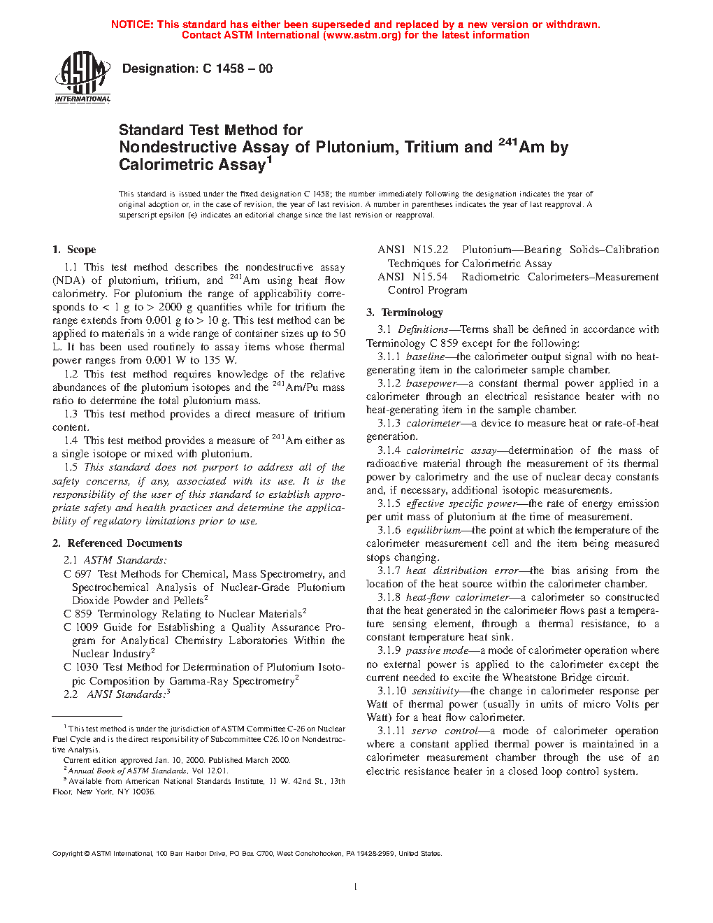 1.1 This test method describes the nondestructive assay (NDA) of plutonium, tritium, and 241Am using heat flow calorimetry. For plutonium the typical range of applicability, depending on the isotopic composition, corresponds to ~0.1 g to ~12 kg quantities while for tritium the typical range is from ~0.001 g to ~400 g. This test method can be applied to materials in a wide range of container sizes up to 380 L. It has been used routinely to assay items whose thermal power ranges from 0.001 W to 135 W.