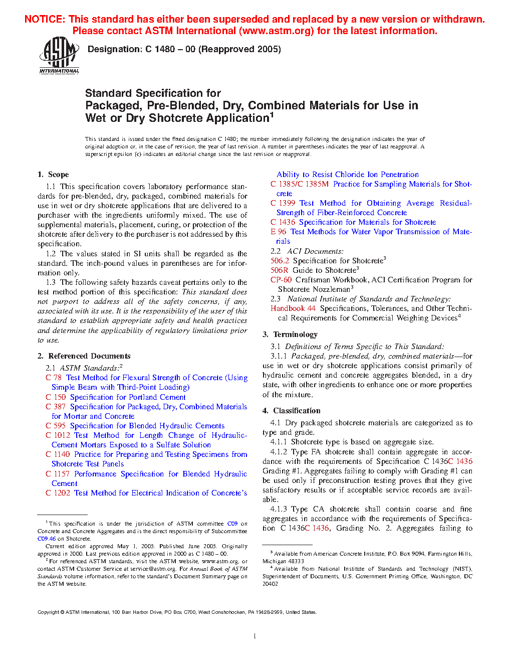 1.1 This specification covers laboratory performance standards for pre-blended, dry, packaged, combined materials for use in wet or dry shotcrete applications that are delivered to a purchaser with the ingredients uniformly mixed. The use of supplemental materials, placement, curing, or protection of the shotcrete after delivery to the purchaser is not addressed by this specification.