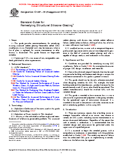 1.1 This guide provides recommendations for remedying existing structural sealant glazing (hereinafter called SSG) installations in situ. Remedial work may be necessary when a lite of glass is replaced, for routine maintenance, or after distress is discovered. This guide focuses on large-scale remedies, not isolated repairs or maintenance.