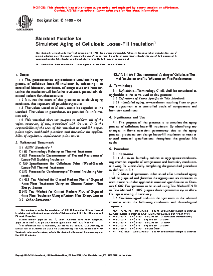 1.1 This practice covers a procedure to simulate the aging process of cellulosic loose-fill insulation by subjecting it to controlled laboratory conditions of temperature and humidity so that the insulation will be further evaluated, particularly for critical radiant flux characteristics.