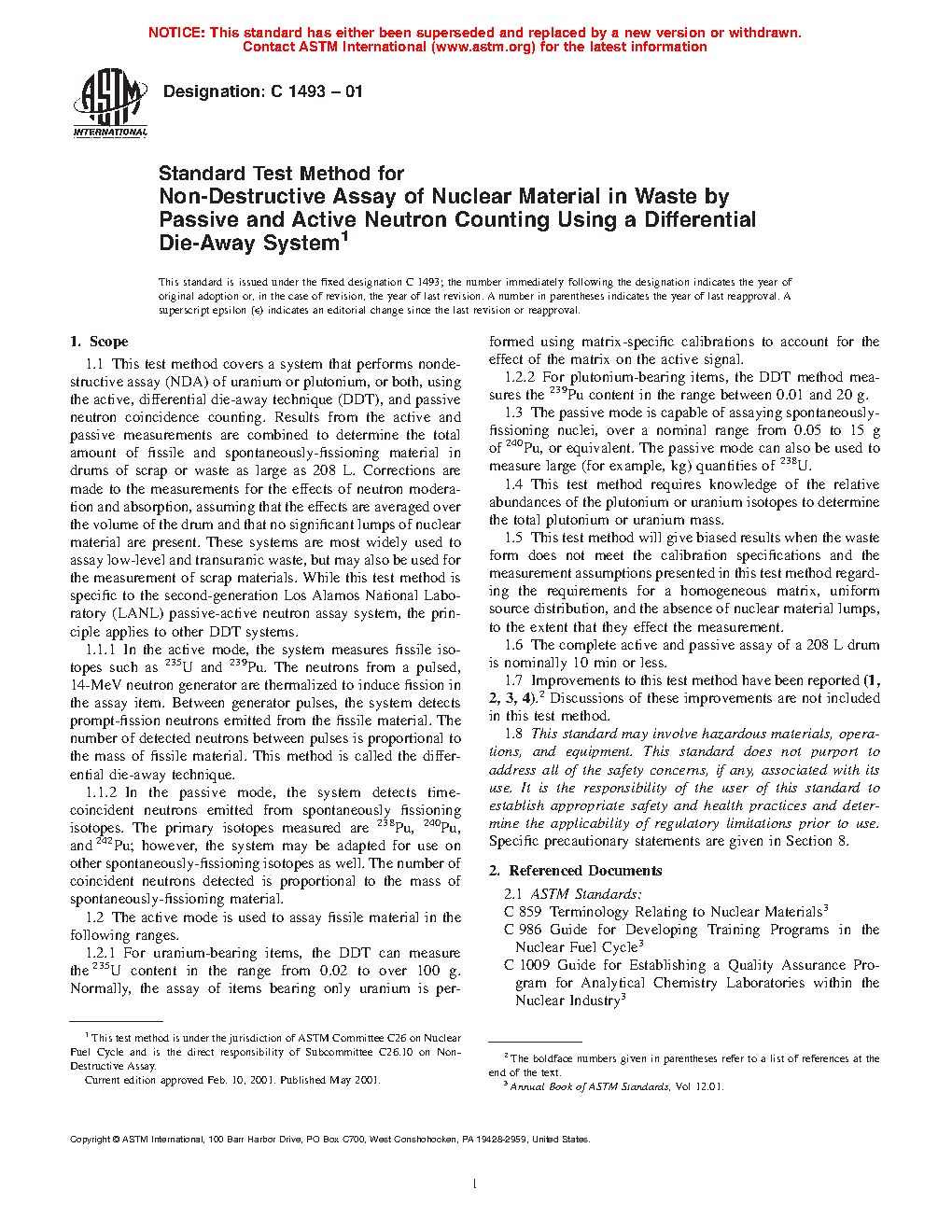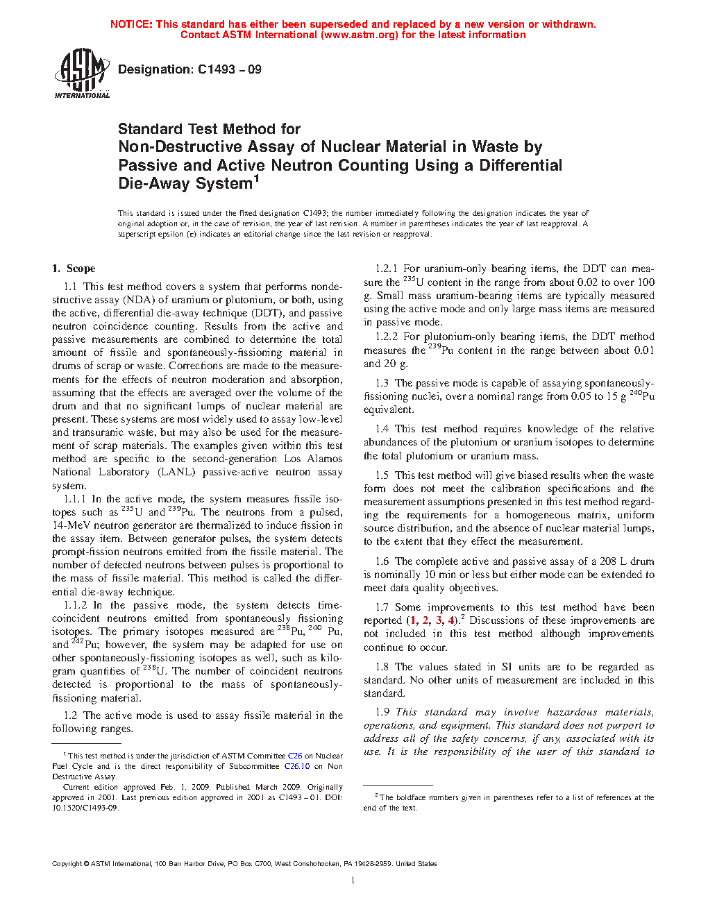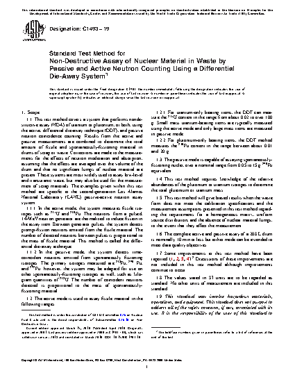 1.1 This test method covers a system that performs nondestructive assay (NDA) of uranium or plutonium, or both, using the active, differential die-away technique (DDT), and passive neutron coincidence counting. Results from the active and passive measurements are combined to determine the total amount of fissile and spontaneously-fissioning material in drums of scrap or waste. Corrections are made to the measurements for the effects of neutron moderation and absorption, assuming that the effects are averaged over the volume of the drum and that no significant lumps of nuclear material are present. These systems are most widely used to assay low-level and transuranic waste, but may also be used for the measurement of scrap materials. The examples given within this test method are specific to the second-generation Los Alamos National Laboratory (LANL) passive-active neutron assay system.