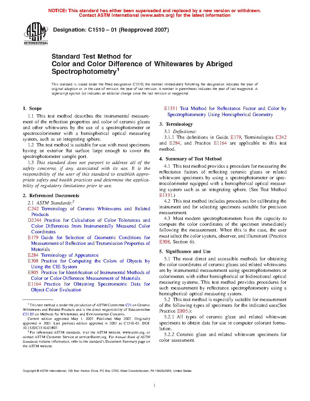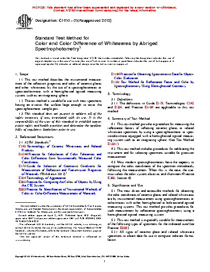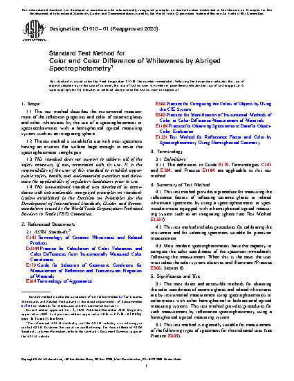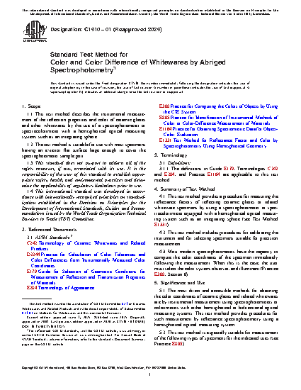 1.1 This test method describes the instrumental measurement of the reflection properties and color of ceramic glazes and other whitewares by the use of a spectrophotometer or spectrocolorimeter with a hemispherical optical measuring system, such as an integrating sphere.
