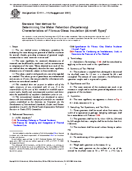 1.1 This test method covers a laboratory procedure for evaluating the water absorption potential of blanket insulation for aircraft, thereby providing a measure of potential weight increase due to water retention in an aircraft.