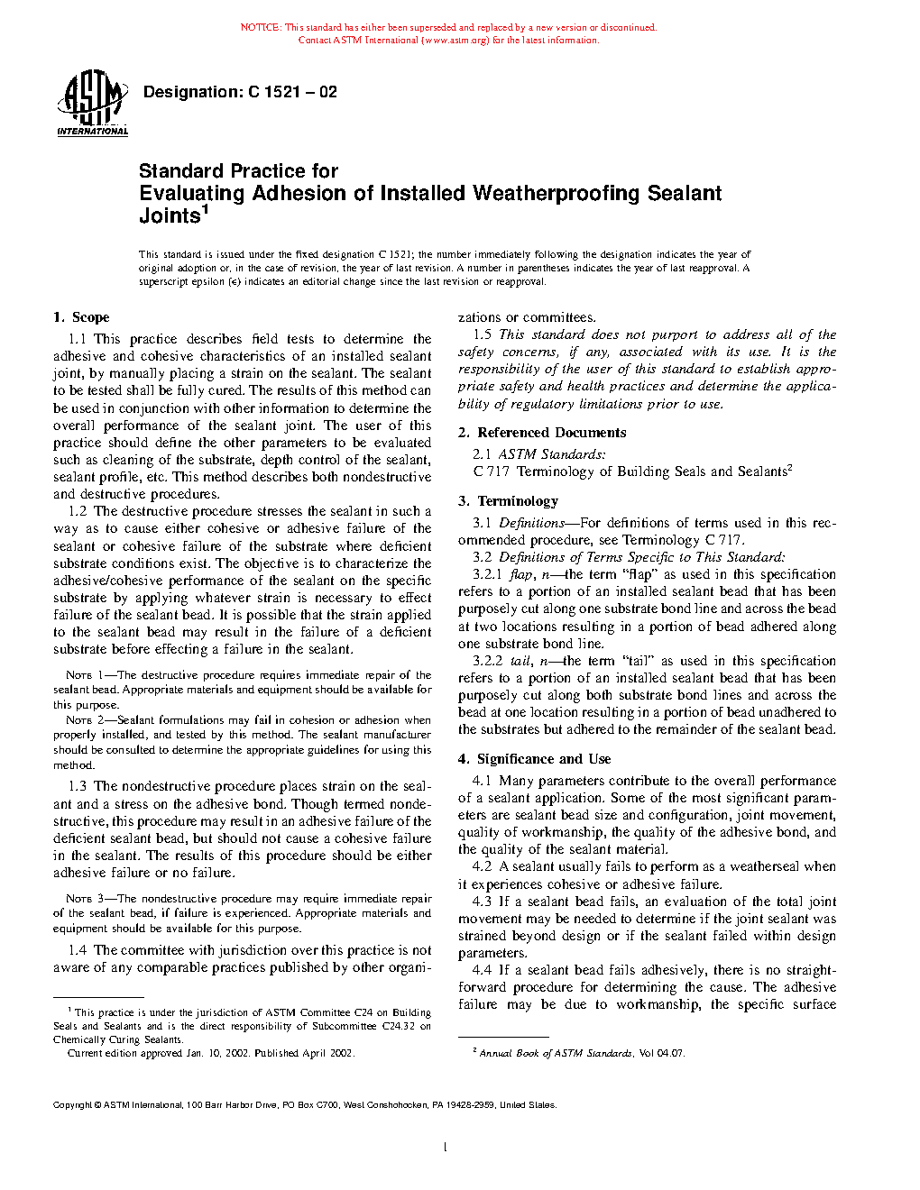 1.3 The nondestructive procedure places strain on the sealant and a stress on the adhesive bond. Though termed nondestructive, this procedure may result in an adhesive failure of the deficient sealant bead, but should not cause a cohesive failure in the sealant. The results of this procedure should be either adhesive failure or no failure.