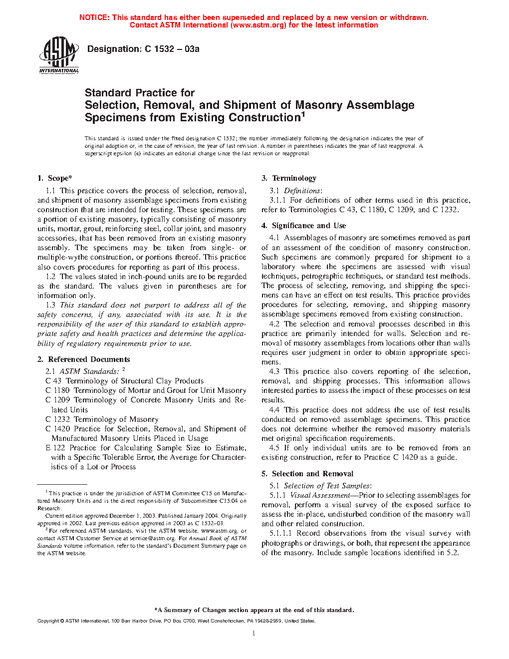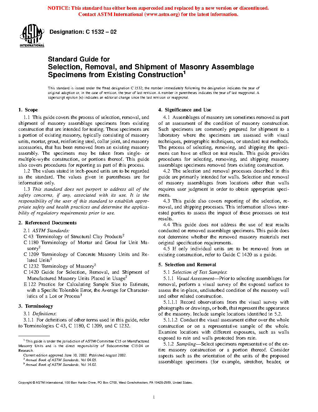 1.1 This guide covers the process of selection, removal, and shipment of masonry assemblage specimens from existing construction that are intended for testing. These specimens are a portion of existing masonry, typically consisting of masonry units, mortar, grout, reinforcing steel, collar joint, and masonry accessories, that has been removed from an existing masonry assembly. The specimens may be taken from single- or multiple-wythe construction, or portions thereof. This guide also covers procedures for reporting as part of this process.