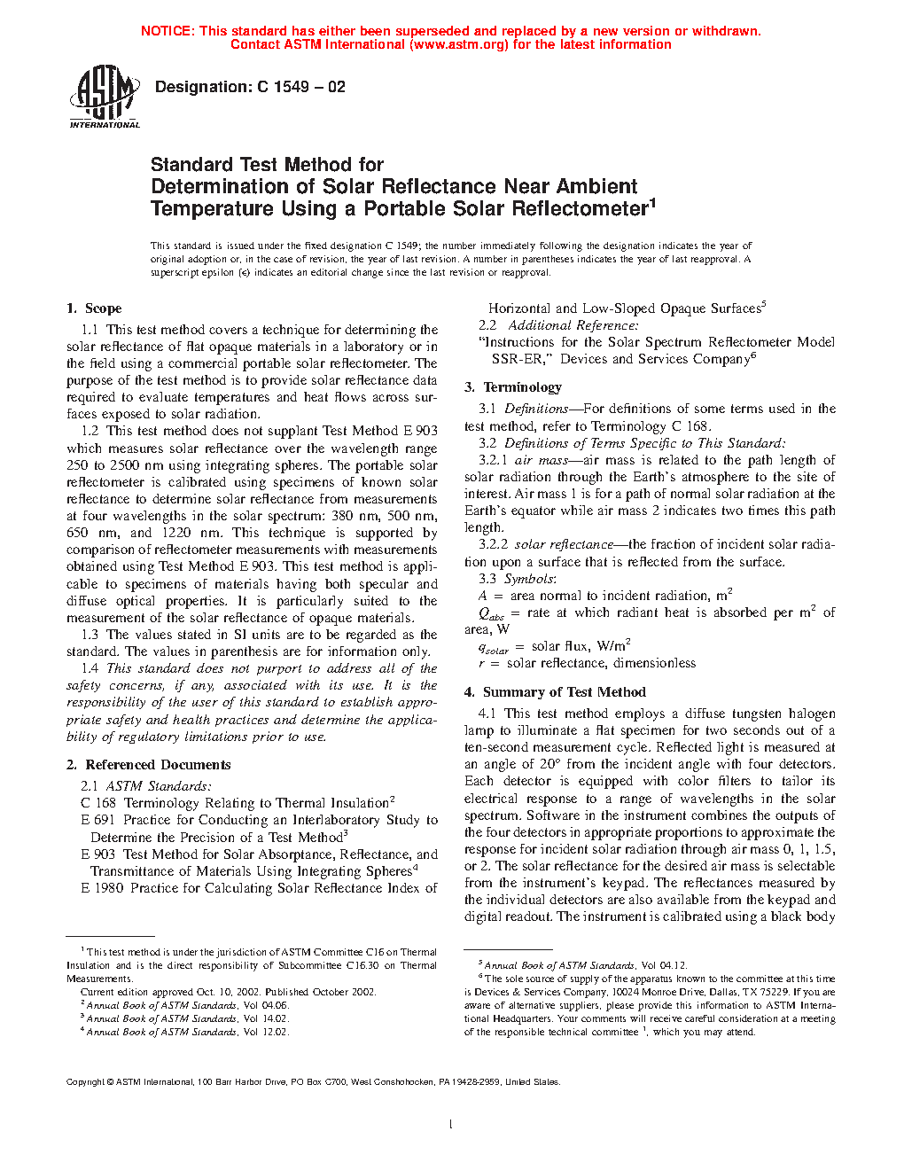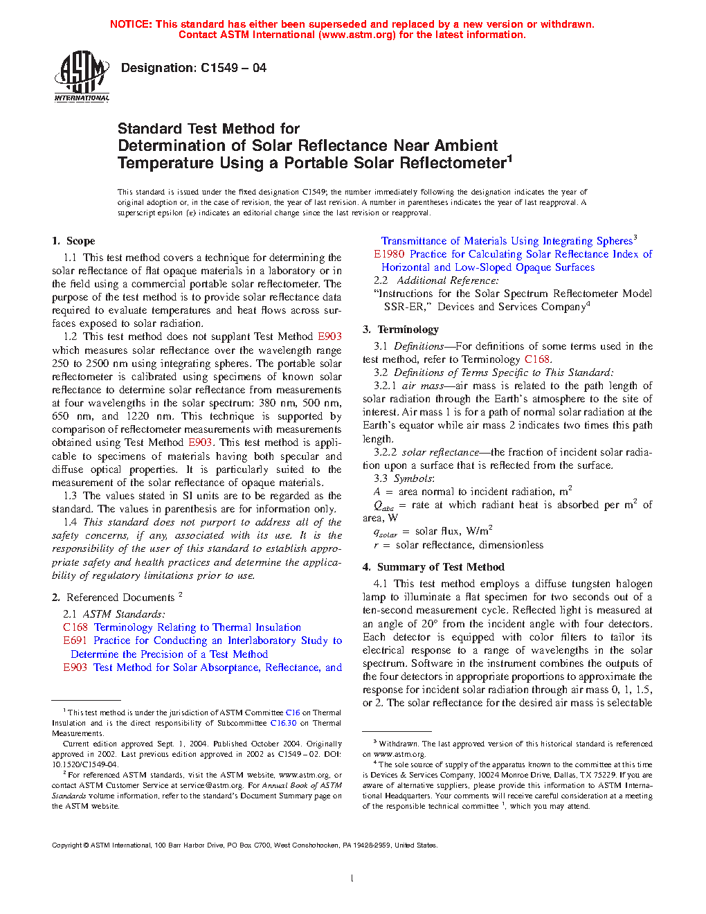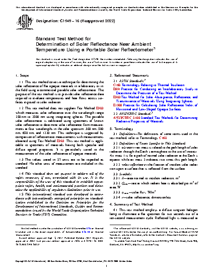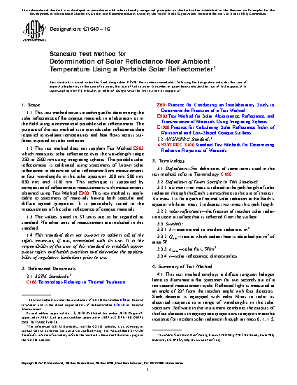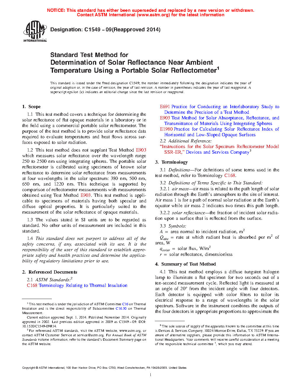 1.2 This test method does not supplant Test Method E903 which measures solar reflectance over the wavelength range 250 to 2500 nm using integrating spheres. The portable solar reflectometer is calibrated using specimens of known solar reflectance to determine solar reflectance from measurements at four wavelengths in the solar spectrum: 380 nm, 500 nm, 650 nm, and 1220 nm. This technique is supported by comparison of reflectometer measurements with measurements obtained using Test Method E903. This test method is applicable to specimens of materials having both specular and diffuse optical properties. It is particularly suited to the measurement of the solar reflectance of opaque materials.