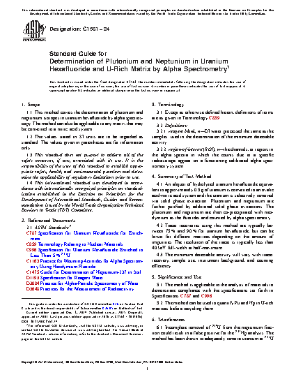 1.1 This method covers the determination of plutonium and neptunium isotopes in uranium hexafluoride by alpha spectroscopy. The method can also be applicable to any matrix that may be converted to a nitric acid system.