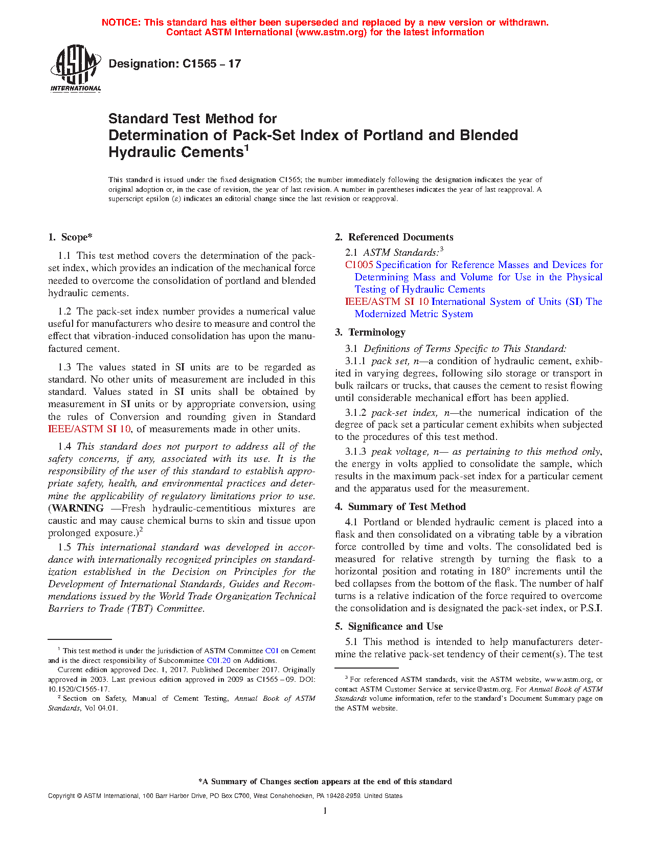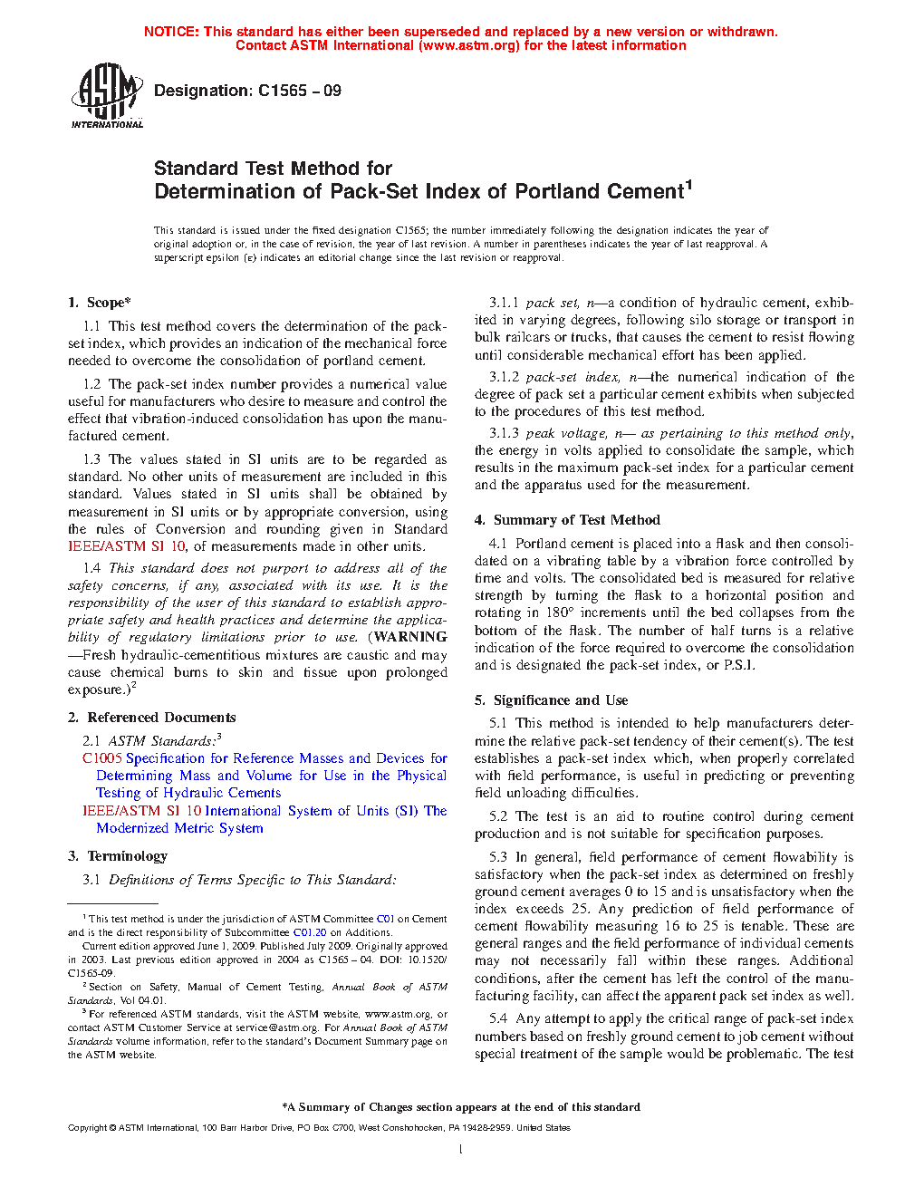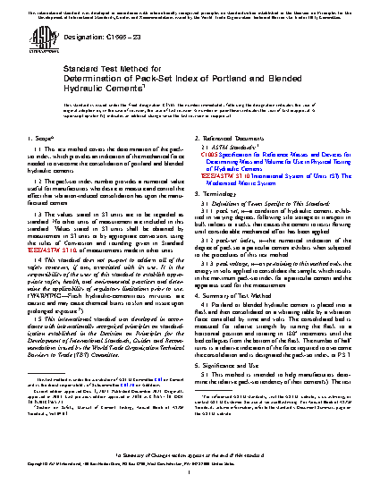 1.1 This test method covers the determination of the pack-set index, which provides an indication of the mechanical force needed to overcome the consolidation of portland cement.