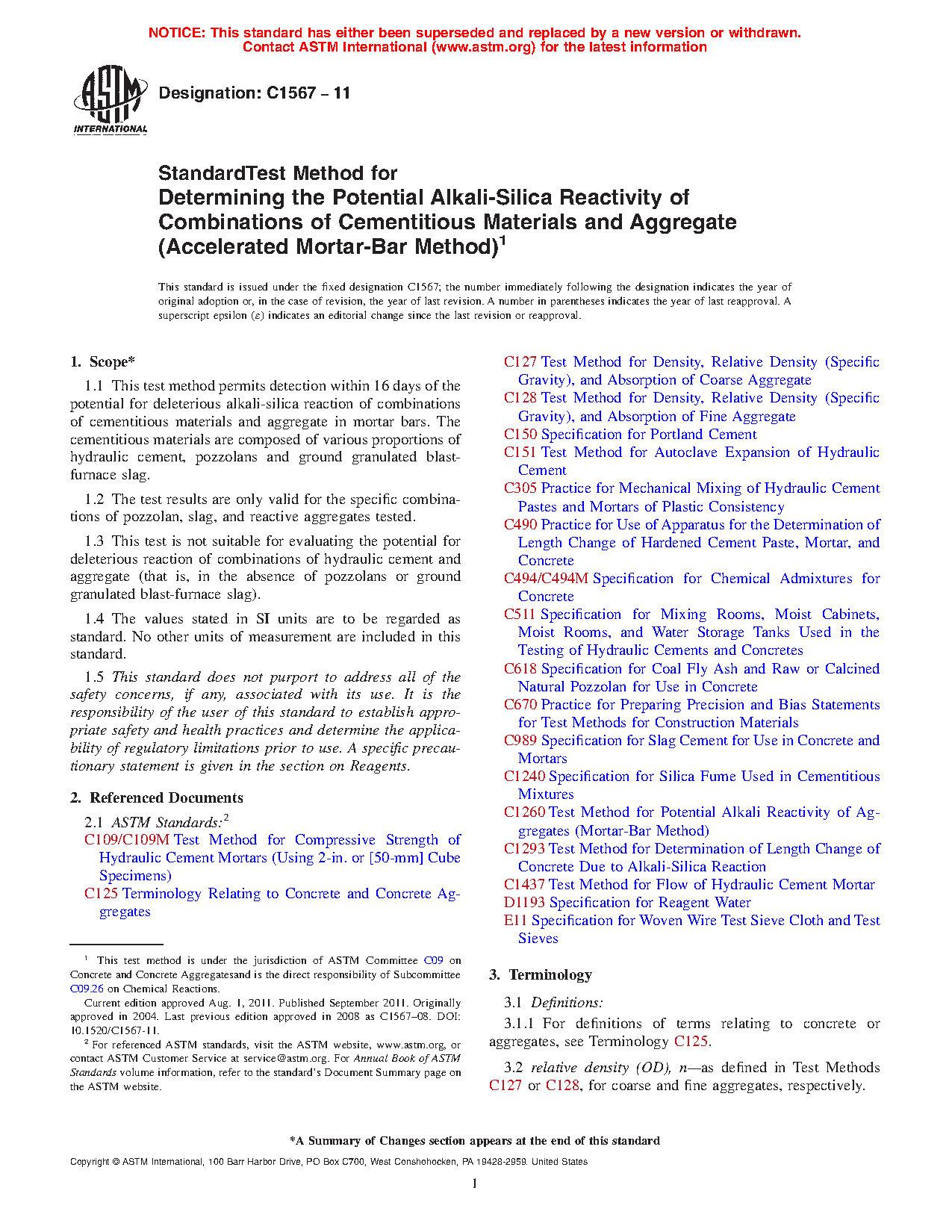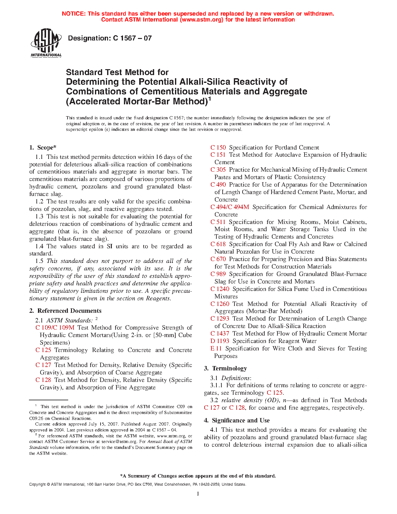 4.1 This test method provides a means for evaluating the ability of pozzolans and ground granulated blast-furnace slag to control deleterious internal expansion due to alkali-silica reaction when used with an aggregate intended for use in concrete. It is based on the Accelerated Test Method developed at the National Building Research Institute (NBRI) in the Republic of South Africa (1-4).3