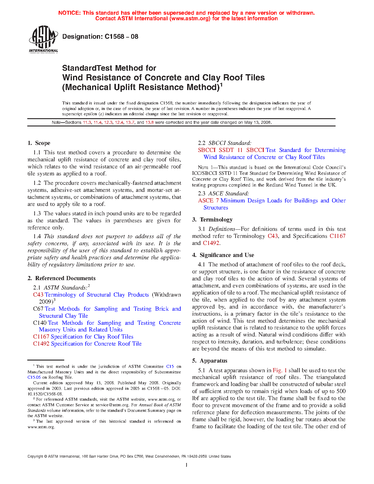 1.1 This test method covers a procedure to determine the mechanical uplift resistance of concrete and clay roof tiles, which relates to the wind resistance of an air-permeable roof tile system as applied to a roof.