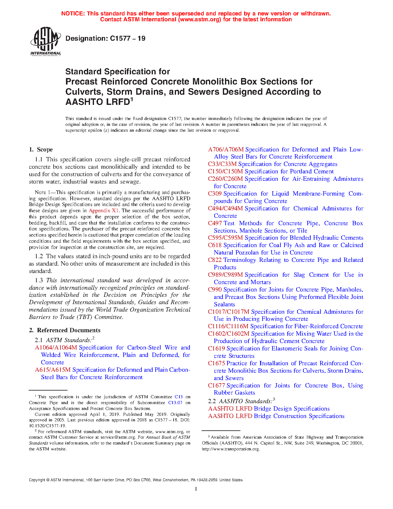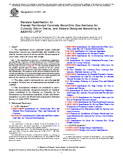 Note 1: This specification is primarily a manufacturing and purchasing specification. However, standard designs per the AASHTO LRFD Bridge Design Specifications are included and the criteria used to develop these designs are given in Appendix X1. The successful performance of this product depends upon the proper selection of the box section, bedding, backfill, and care that the installation conforms to the construction specifications. The purchaser of the precast reinforced concrete box sections specified herein is cautioned that proper correlation of the loading conditions and the field requirements with the box section specified, and provision for inspection at the construction site, are required.