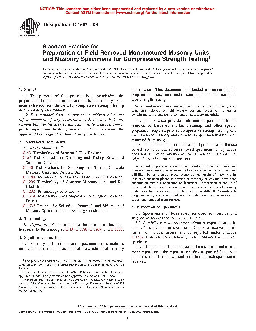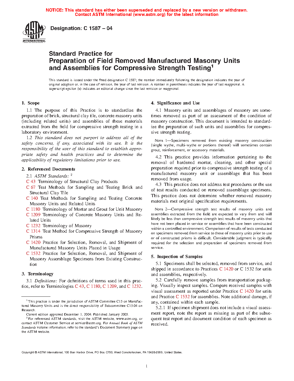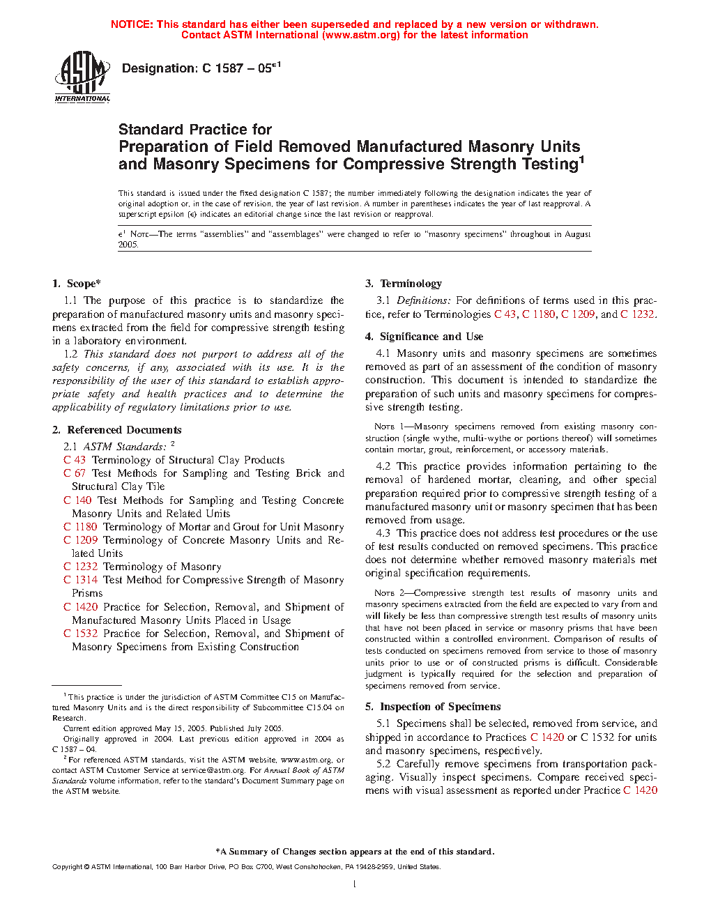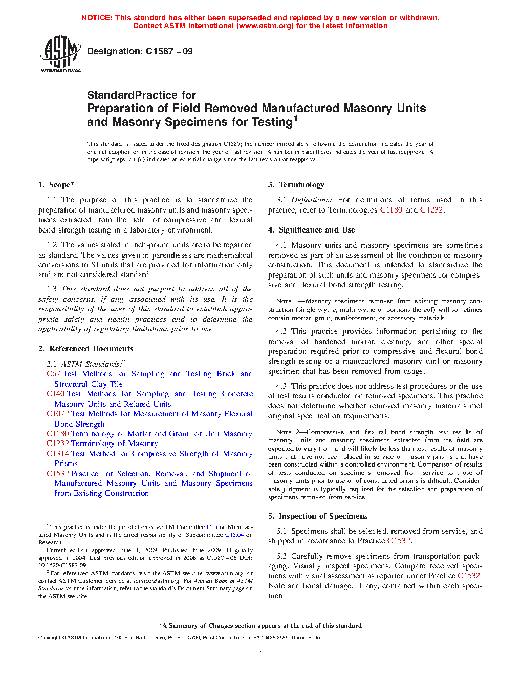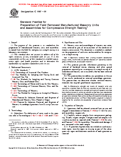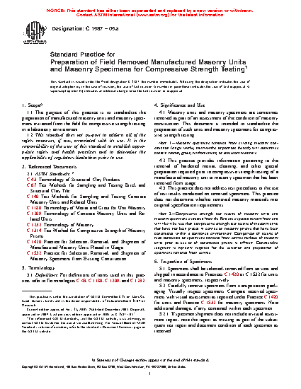 This practice does not address test procedures or the use of test results conducted on removed specimens. This practice does not determine whether removed masonry materials met original specification requirements.