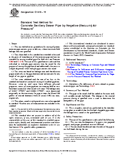 1.1 This test method covers procedures for testing of precast concrete pipe sections, prior to delivery, where maximum field leakage rates are specified.