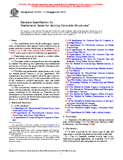 1.1 This specification covers the physical property requirements of elastomeric seals (gaskets) used to seal the joints of precast concrete structures conforming to Specifications C14, C14M, C118, C118M, C361, C361M, C443, C443M, C505, or C505M used in gravity and low head pressure applications.