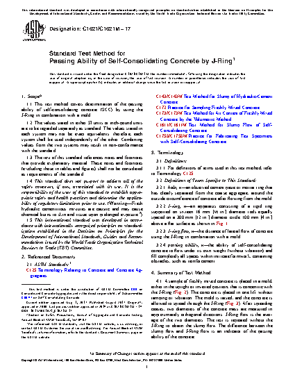 1.1 This test method covers determination of the passing ability of self-consolidating concrete (SCC) by using the J-Ring in combination with a mold.