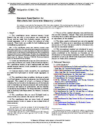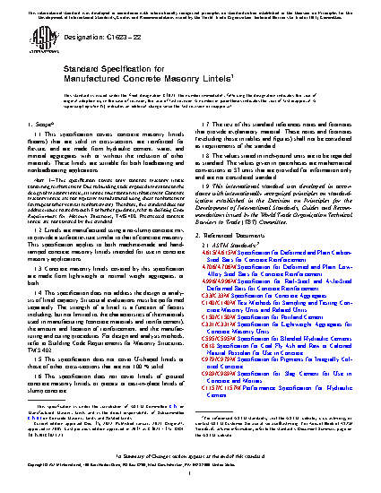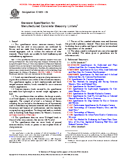 1.2 Lintels are manufactured using a no-slump concrete mix to provide a surface texture similar to that of concrete masonry. This specification applies to both machine-made and hand-tamped concrete masonry lintels intended for use in concrete masonry applications.
