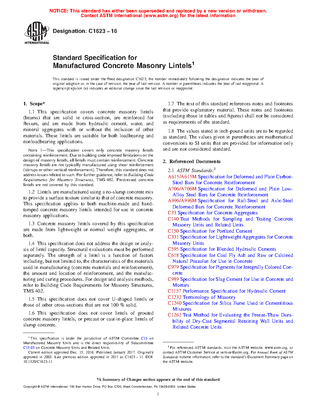 Note 1: This specification covers only concrete masonry lintels containing reinforcement. Due to building code imposed limitations on the design of masonry lintels, all lintels must contain reinforcement. Concrete masonry lintels are not typically manufactured using shear reinforcement (stirrups or other vertical reinforcement). Therefore, this standard does not address issues related to such. For further guidance, refer to Building Code Requirements for Masonry Structures, TMS 402. Prestressed concrete lintels are not covered by this standard.