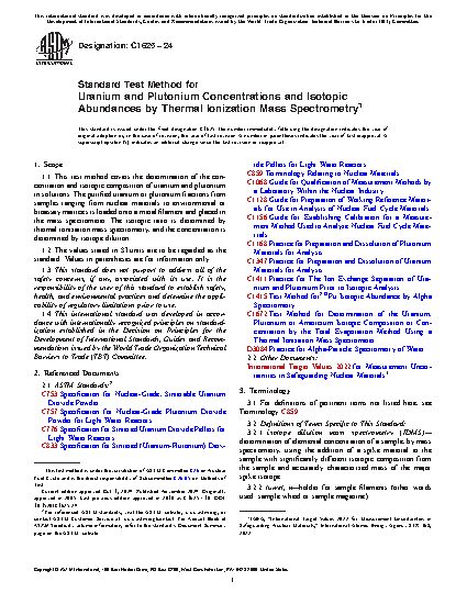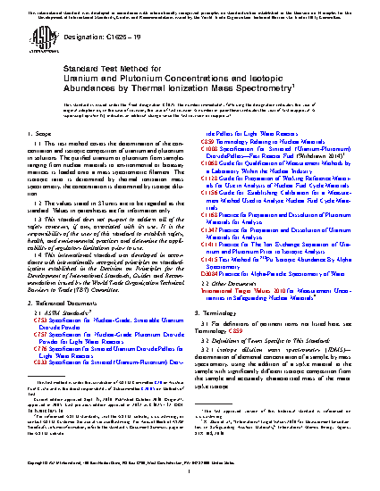 5.1 Uranium and plutonium oxides can be used as a nuclear-reactor fuel in the form of pellets. In order to be suitable for use as a nuclear fuel the starting material must meet certain specifications, such as found in Specifications C757, C833, C753, C776, or as specified by the purchaser. The uranium concentration, plutonium concentration, or both, and the isotopic abundances are measured by mass spectrometry following this test method.