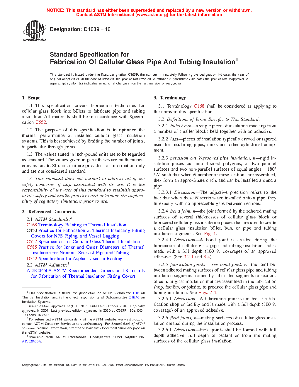 1.1 This specification covers fabrication techniques for cellular glass block into billets to fabricate pipe and tubing insulation. All materials shall be in accordance with Specification C552.